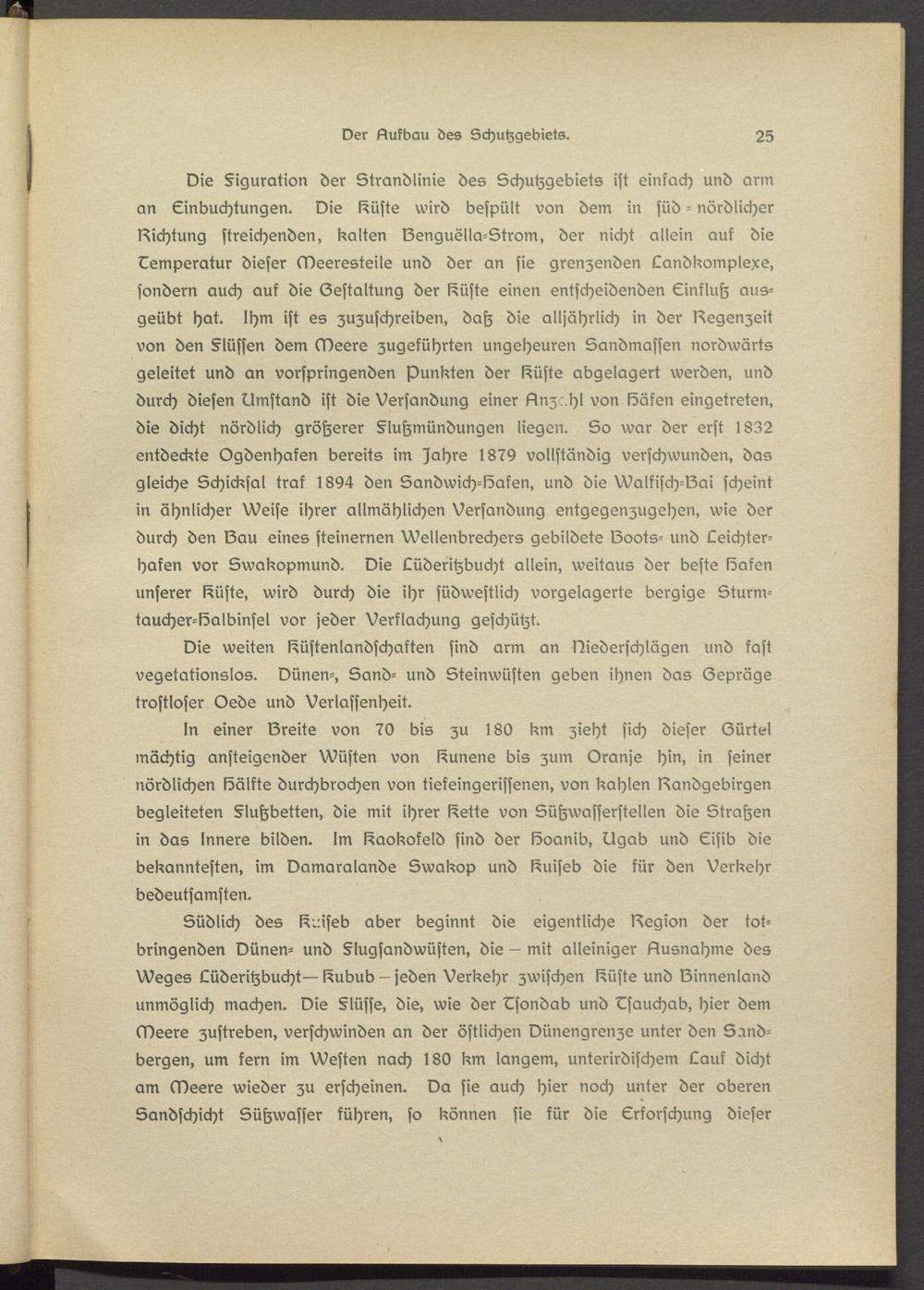 In einer Srsits von 70 bis zu 180 km zieht sich dieser Gürtel mächtig ansteigender Wüsten von I^unene bis zum Oranjs hin, in seiner nördlichen Sälkte durchbrochen von tieksingerissenen, von kahlen Sandgebirgen begleiteten §lußbstten, die mit ihrer l^etts von Sühwasssrstellsn die Straßen in das Innere bilden. Im l^aokokeld sind der Soanib, Ugab und Eisib die bekanntesten, im Damaralande Swakop und I^uiseb die kür den Verkehr bedeutsamsten.
