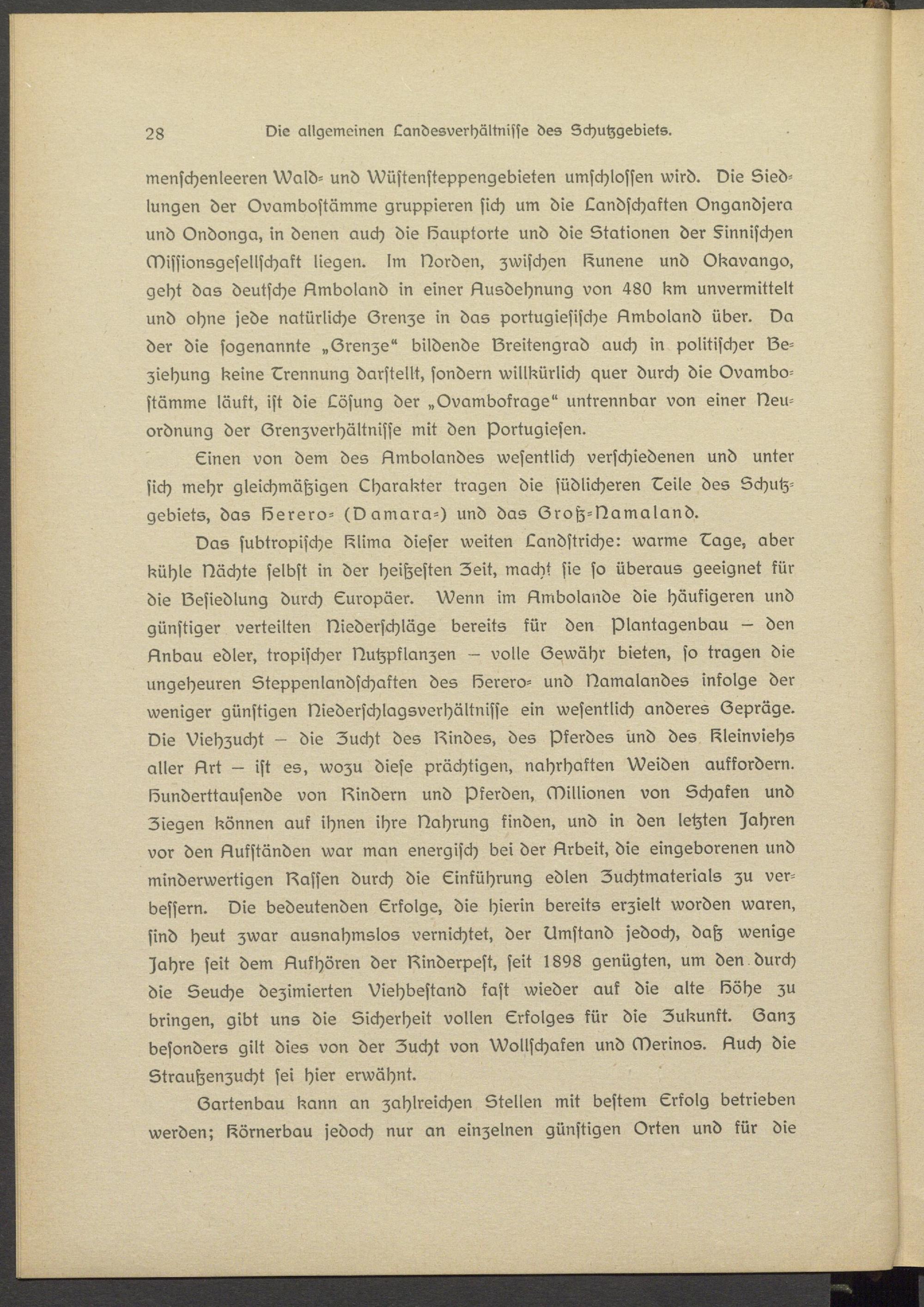 Das subtropische Mima dieser weiten Landstriche: warme Eags, aber kühle Nächte selbst in der heißesten Zeit, macht sie so überaus geeignet kür die Besiedlung durch Europäer. Wenn im Bmbolande die häufigeren und günstiger verteilten Niederschlüge bereits kür den plantagsnbau — den Bnbau edler, tropischer Nutzpflanzen — volle Gewähr bieten, so tragen die ungeheuren Stsppenlandschakten des löerero- und Namalandes infolge der weniger günstigen Nisdsrschlagsvsrhältnisss ein wesentlich anderes Gepräge. Nie Viehzucht — die Zucht des Bindes, des Pferdes und des Kleinviehs aller Brt — ist es, wozu diese prächtigen, nahrhaften Weiden auffordern, löundsrttaussnde von Bindern und Pferden, (Billionen von Schaken und Ziegen können auf ihnen ihre Nahrung finden, und in den letzten fahren vor den Bukständen war man energisch bei der Brbeit, die eingeborenen und minderwertigen Bassen durch die Einführung edlen Zuchtmaterials zu verbessern. Die bedeutenden Erfolge, die hierin bereits erzielt worden waren, sind heut zwar ausnahmslos vernichtet, der Umstand jedoch, daß wenige ^sahrs seit dem Bufhören der Binderpest, seit 1898 genügten, um den durch die Seuche dezimierten Viehbestand käst wieder auf die alte lööhs zu bringen, gibt uns die Sicherheit vollen Erfolges kür die Zukunft. Ganz besonders gilt dies von der Zucht von Wollschafen und (Bsrinos. Buch die Straußenzucht sei hier erwähnt.