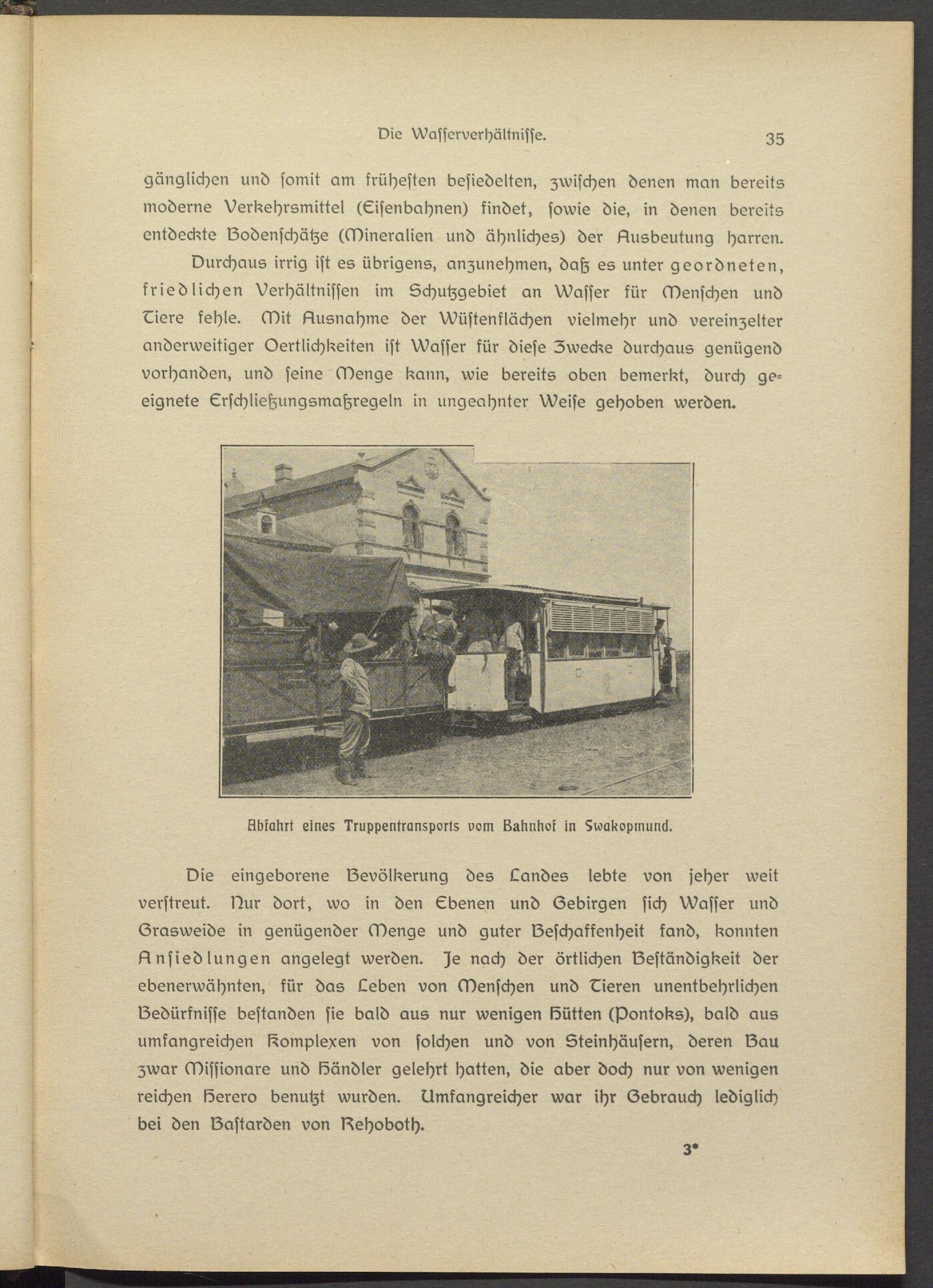 Durchaus irrig ist es übrigens, anzunehmen, daß es unter geordneten, friedlichen Verhältnissen im Schutzgebiet an Wasser kür Menschen und Eiere kehle. Mit Ausnahme der Wüstenklächen vielmehr und vereinzelter anderweitiger Oertlichkeiten ist Wasser für diese Zwecks durchaus genügend vorhanden, und seine Menge kann, wie bereits oben bemerkt, durch geeignete Erschlietzungsmatzregeln in ungeahnter Weise gehoben werden.