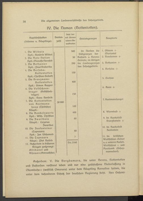 Nuhsrdem: V. Die IZergdamara, die unter töersro, Gottentotten und IZastardsn verstreut leben und nur eine geschlossene Niederlassung in Okombahs-l- (westlich Omaruru) unter dem köäuptling Cornelius haben, die unter dem besonderen Schutz der deutschen Legierung steht. Ihre Gesamt-