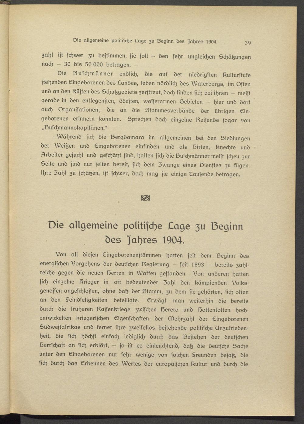 Von all diesen Eingsborenenstämmen hatten seit dem Beginn des energischen Vorgehens der deutschen Begierung - seit 18Y3 — bereits zahlreiche gegen die neuen Berren in Waffen gestanden. Von anderen hatten sich einzelne Krieger in oft bedeutender Zahl den kämpfenden Volksgenossen angeschlossen, ohne dah der Stamm, zu dem sie gehörten, sich offen an den Feindseligkeiten beteiligte. Erwägt man weiterhin die bereits durch die früheren Bassenkriegs zwischen Bsrero und Bottentottsn hochentwickelten kriegerischen Eigenschaften der Mehrzahl der Eingeborenen Südwestakrikas und ferner ihre zweifellos bestehende politische Unzufriedenheit, die sich höchst einfach lediglich durch das Bestehen der deutschen Berrschakt an sich erklärt, — so ist es einleuchtend, dah die deutsche Sache unter den Eingeborenen nur sehr wenige von solchen freunden besah, die sich durch das Erkennen des Wertes der europäischen Cultur und durch die