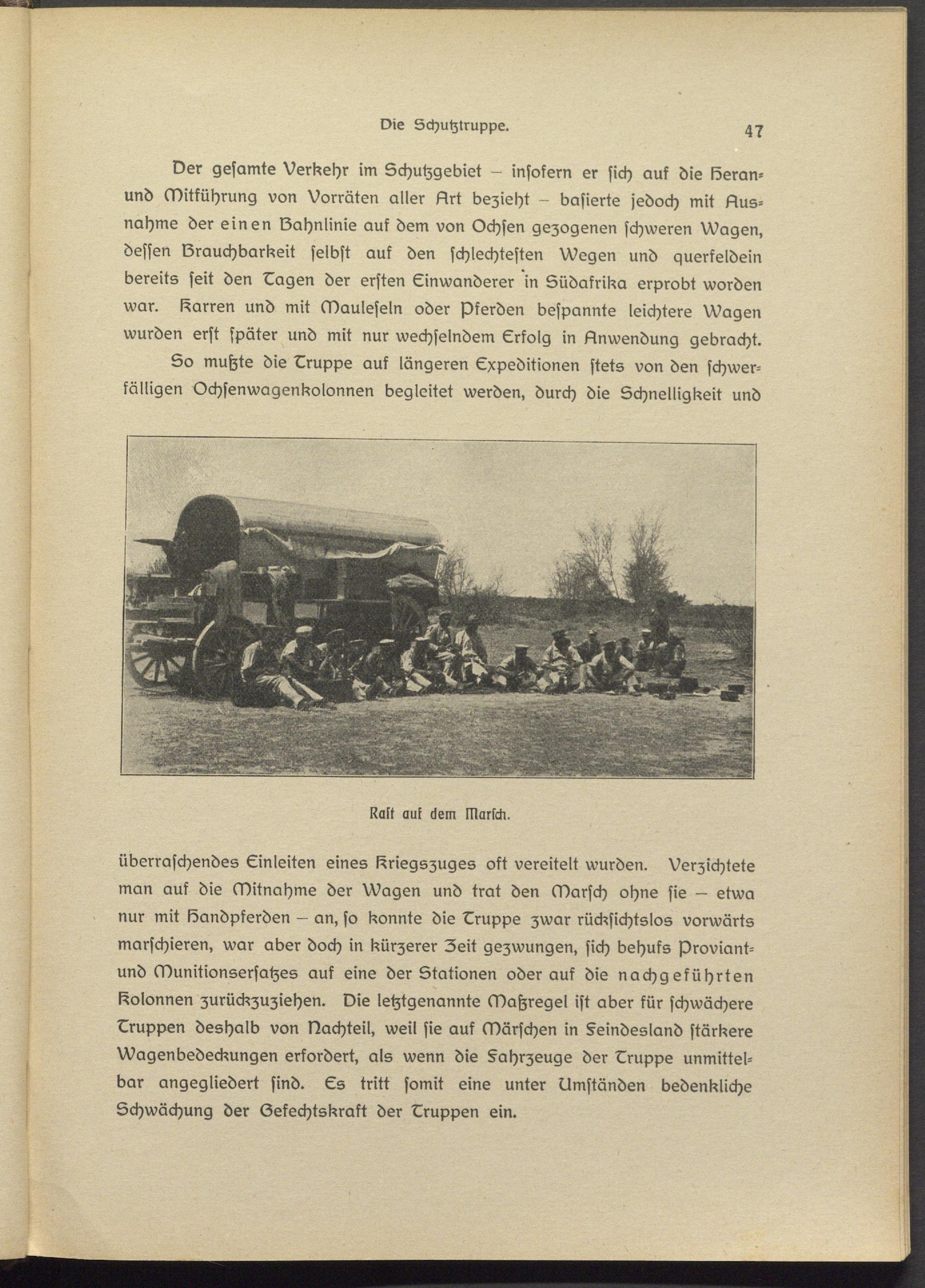 Der gesamte Verkehr im Schutzgebiet - insofern er sich auf die Seran- und Mitkührung von Vorräten aller flrt bezieht - basierte jedoch mit Ausnahme der einen Sahnlinie auf dem von Ochsen gezogenen schweren Wagen, dessen Brauchbarkeit selbst auk den schlechtesten Wegen und querfeldein bereits seit den Tagen der ersten Einwanderer in Südafrika erprobt worden war. darren und mit Mauleseln oder Pferden bespannte leichtere Wagen wurden erst später und mit nur wechselndem Erfolg in Anwendung gebracht.