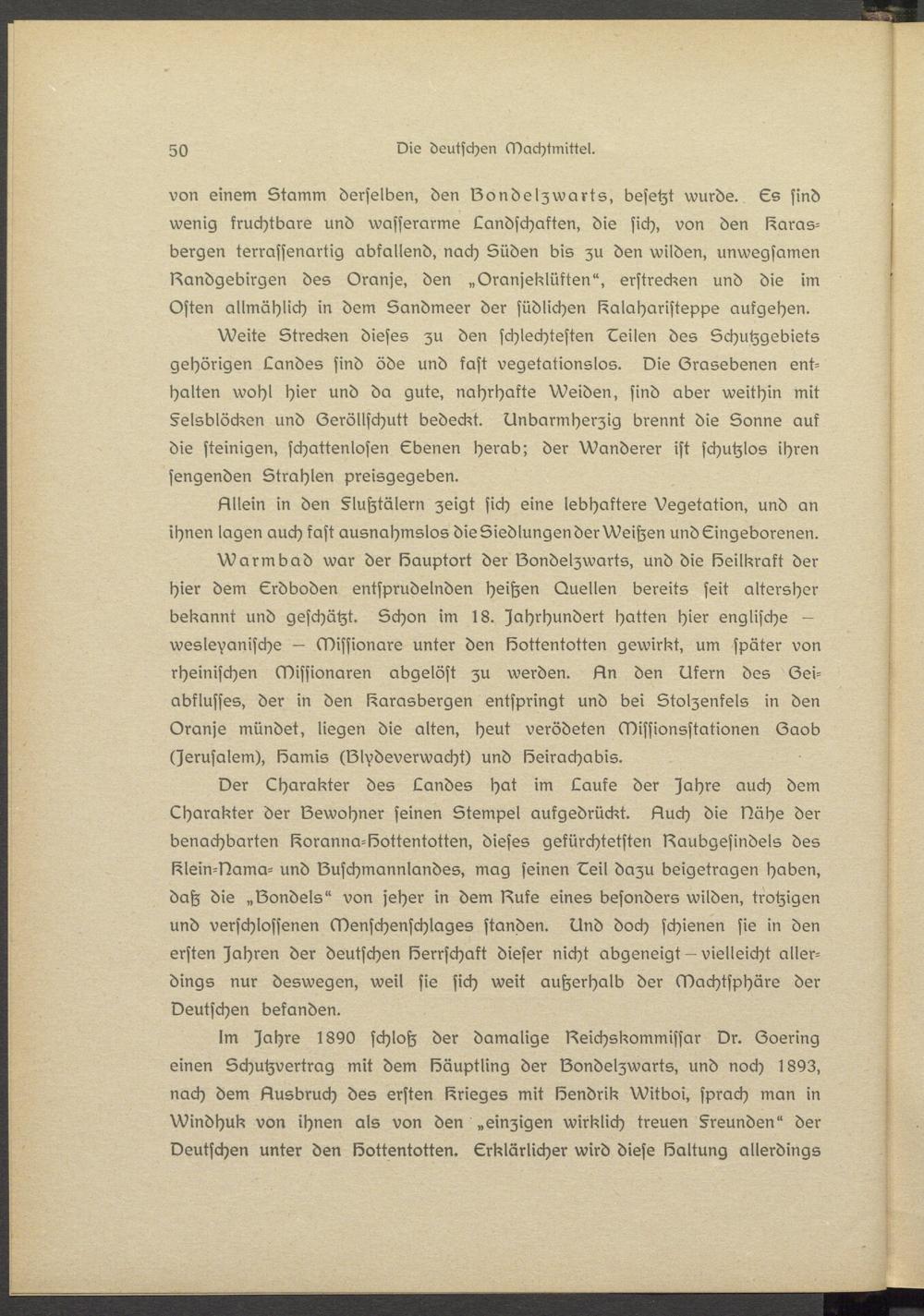 Warmbad war der löauptort der lZondslzwarts, und die lZsilkrakt der hier dem Erdboden sntsprudelnden heißen Quellen bereits seit altersher bekannt und geschätzt. Schon im 18. Jahrhundert hatten hier englische - wssle^anlsche — Missionare unter den köottentotten gewirkt, um später von rheinischen Missionaren abgelöst zu werden. Lln den Ufern des (Zei- abklusses, der in den I^arasbergen entspringt und bei Stolzenfsls in den Oranss mündet, liegen die alten, heut verödeten Missionsstationsn (Zaob (Jerusalem), Samis (lZIydeverwacht) und löeirachabis.