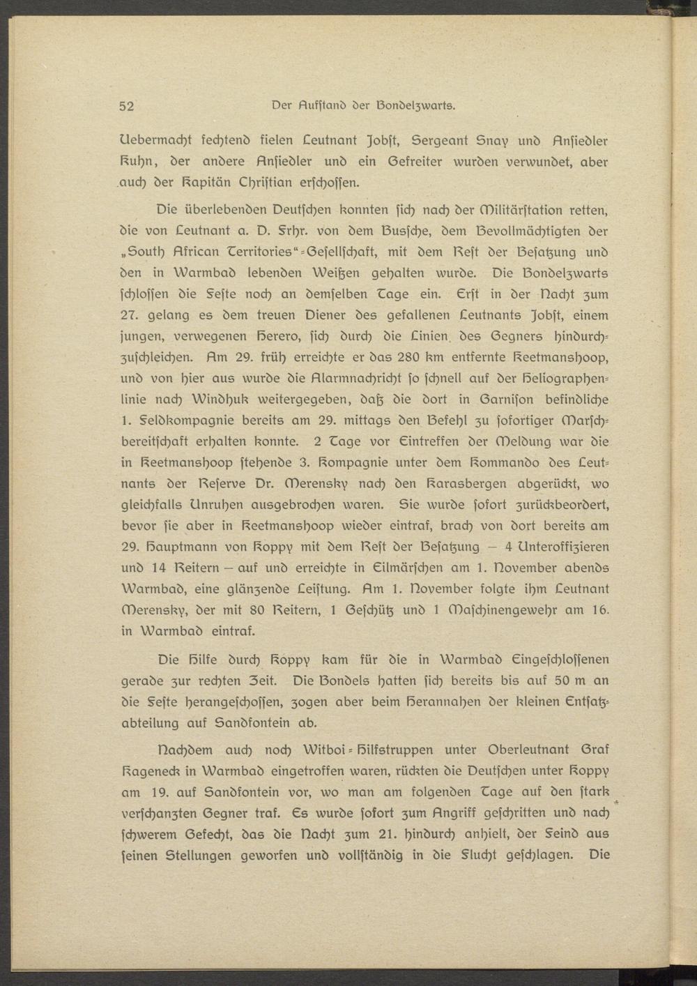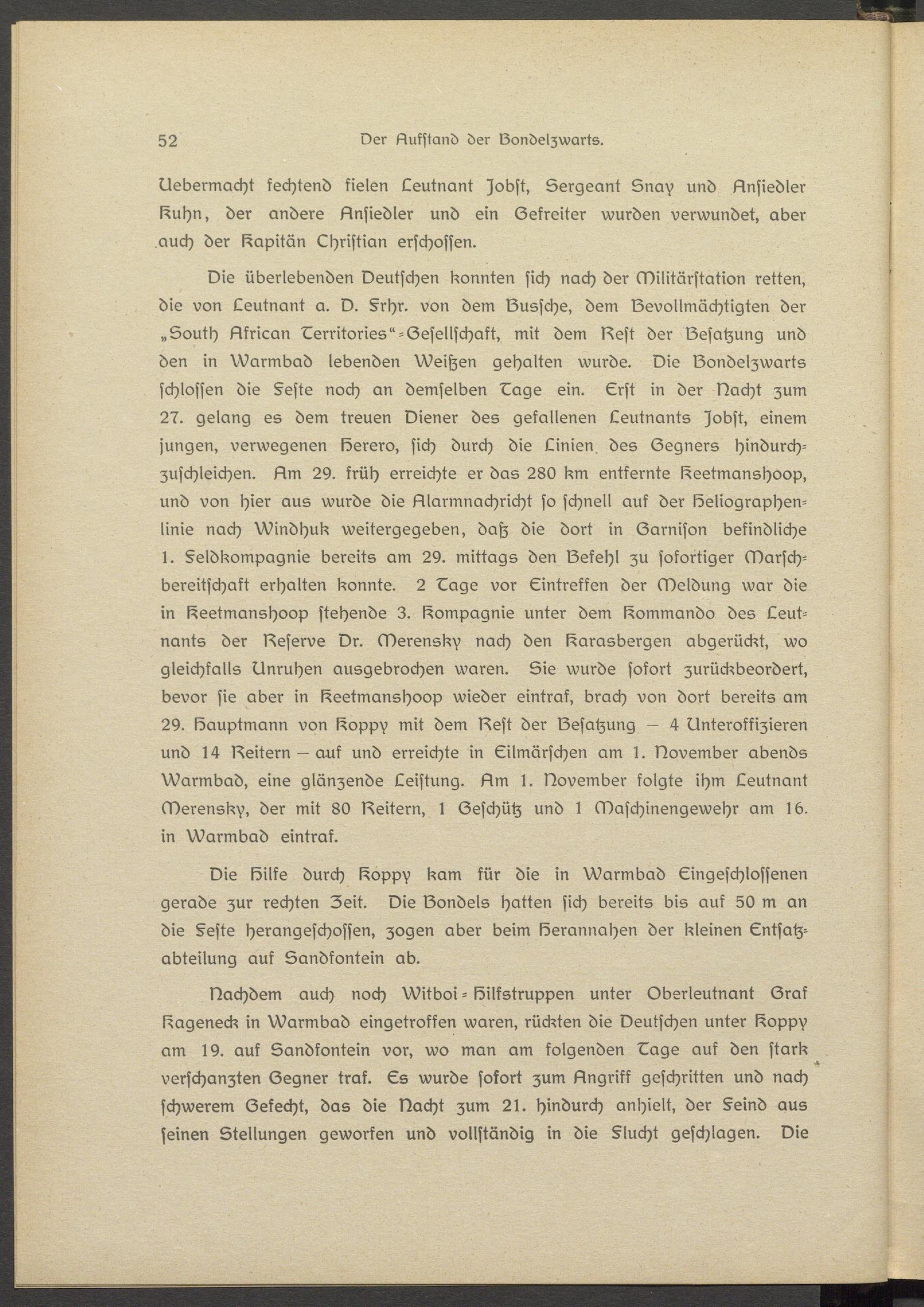 Die Silke durch Soppv kam kür die in Warmbad Eingeschlossenen gerade zur rechten Zeit. Die Gondels hatten sich bereits bis auf 50 m an die §este herangeschosssn, zogen aber beim Serannahsn der kleinen Entsatz- abteilung auf Sandfontsin ab.