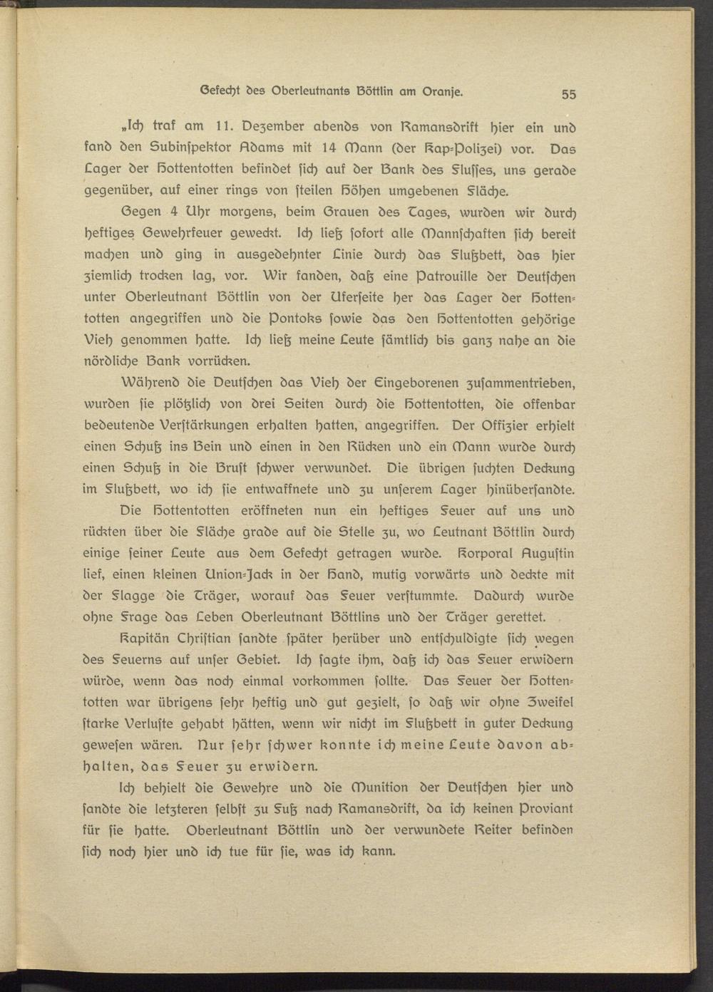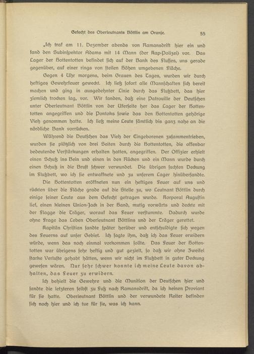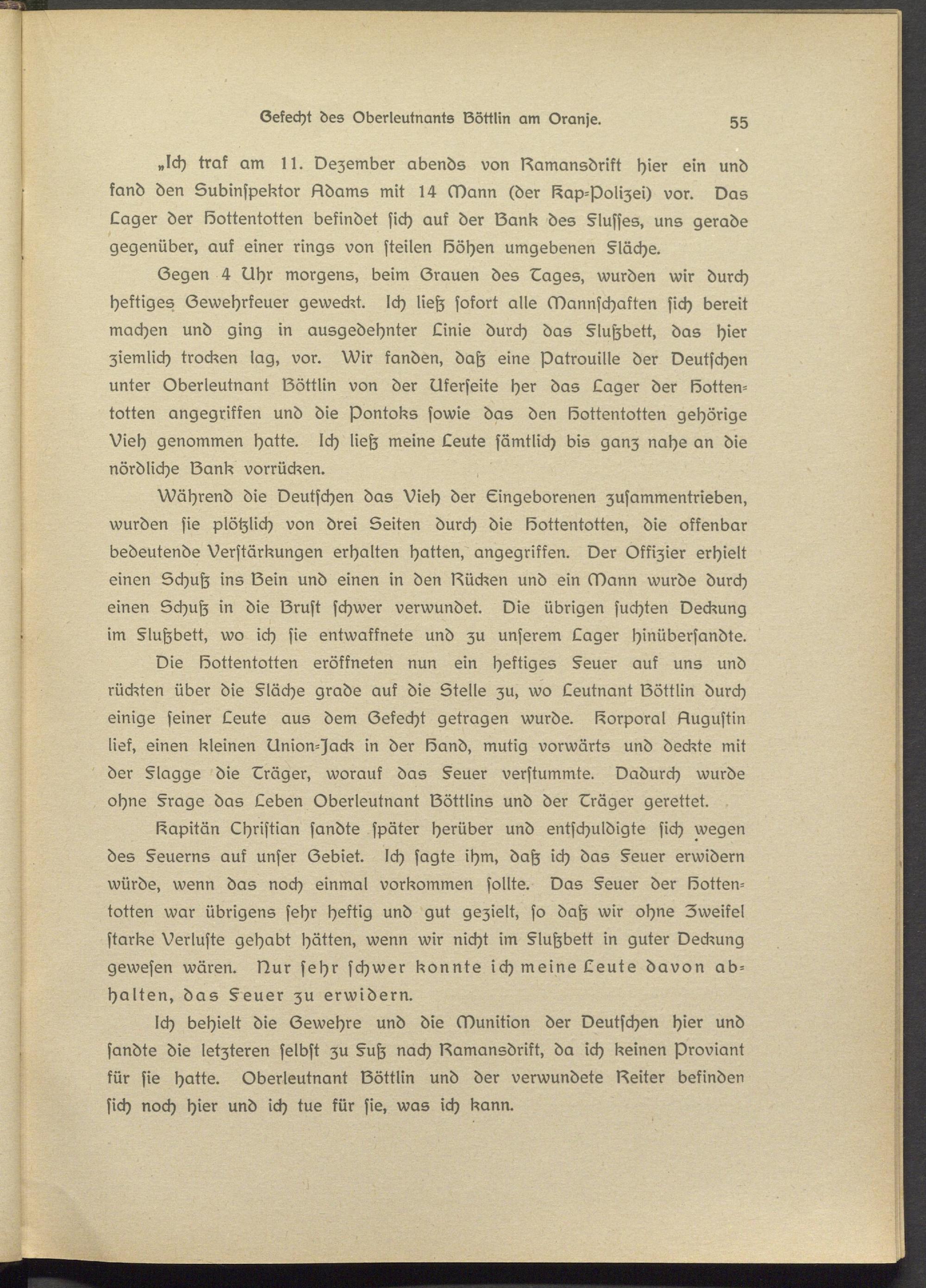 Ich behielt die Gewehre und die Munition der Deutschen hier und sandte die letzteren selbst zu §uh nach Damansdrikt, da ich keinen Proviant kür sie hatte. Oberleutnant Döttlin und der verwundete Dsiter befinden sich noch hier und ich tue kür sie, was ich kann.