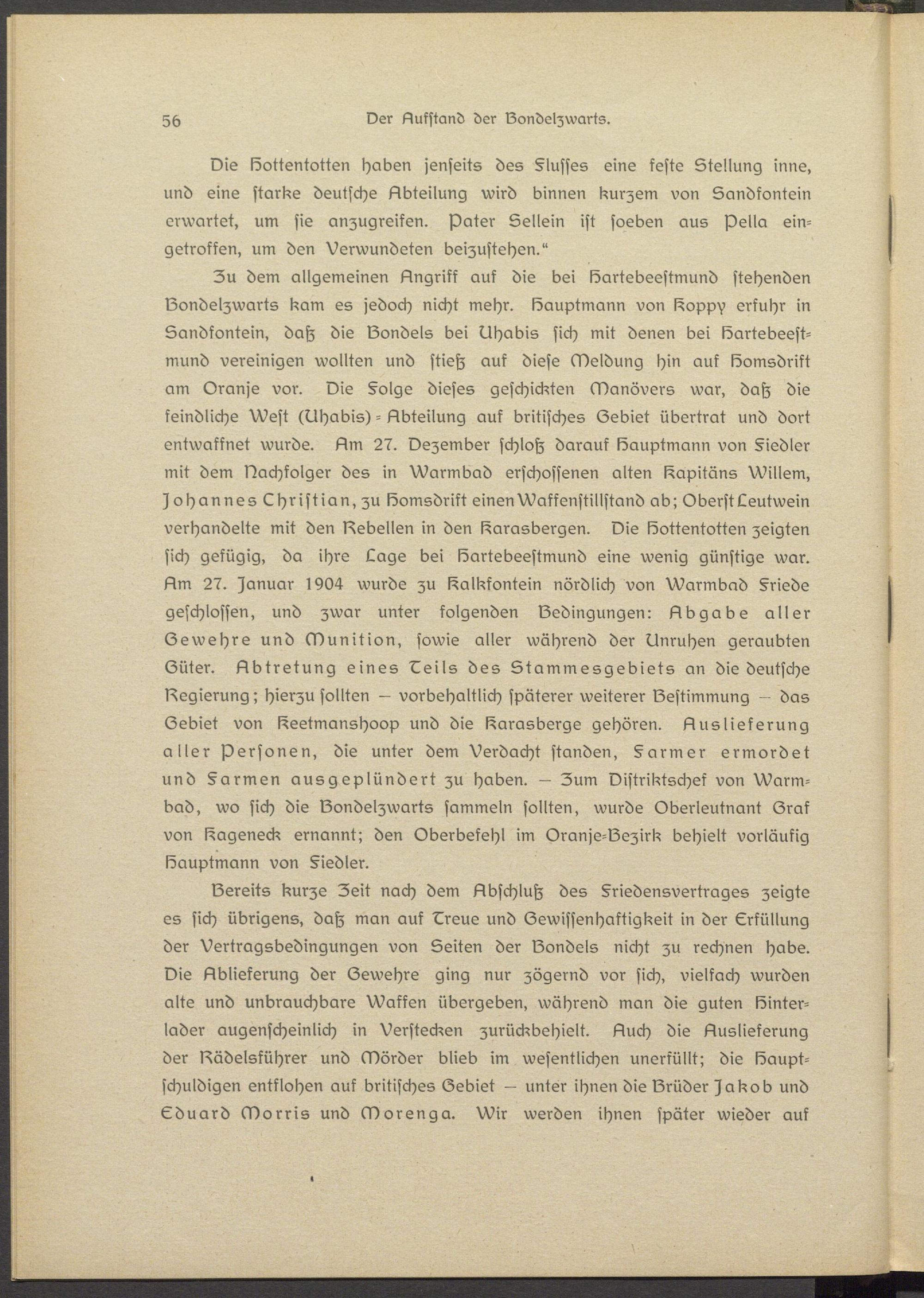 Zu dem allgemeinen Angriff auf die bei Sartebesstmund stehenden IZondelzwarts kam es jedoch nicht mehr. Sauptmann von I^oppv erfuhr in Sandkontein, daß die IZondels bei Ghabis sich mit denen bei Sartsbsest- mund vereinigen wollten und stieß auf diese Meldung hin auk Somsdrift am Oranje vor. Die §olge dieses geschickten Manövers war, daß die feindliche "West (Ghabis) - Abteilung auf britisches Gebiet übertrat und dort entwaffnet wurde. Am 27. Dezember schloß darauf Sauptmann von Siedler mit dem Dachfolger des in Warmbad erschossenen alten Kapitäns Willem, Johannes Christian, zu Somsdrift einen Waffenstillstand ab; Oberst Lsutwein verhandelte mit den Aebsllen in den Sarasbsrgen. Die Sottentottsn zeigten sich gefügig, da ihre Lage bei Sartebeestmund eins wenig günstige war. Am 27. Januar 1904 wurde zu l^alktontsin nördlich von Warmbad §riede geschlossen, und zwar unter folgenden Bedingungen: Abgabe aller Gewehre und Munition, sowie aller während der Unruhen geraubten Güter. Abtretung eines Csils des Stammesgebiets an die deutsche Aegierung; hierzu sollten - vorbehaltlich späterer weiterer lZsstimmung - das Gebiet von I^eetmanshoop und die I^arasbergs gehören. Auslieferung aller Personen, die unter dem Verdacht standen, § armer ermordet und §armsn ausgeplündert zu haben. - Zum Distriktschsk von Warmbad, wo sich die IZondelzwarts sammeln sollten, wurde Oberleutnant Graf von Sageneck ernannt; den Oberbefehl im Oranjs-IZszirk behielt vorläufig Sauptmann von §iedler.