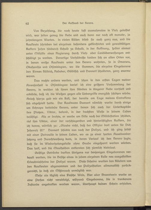 Von Sezahlung, die noch heute fast ausnahmslos in Vieh geleistet wird, war selten genug die Aede und auch dann nur nach okt monate-, ja jahrelangem Warten. In vielen §ällen blieb sie auch ganz aus, und die Kaufleute schrieben bei einzelnen besonders gefurchtsten und gewalttätigen Raffern )ahrs hindurch Schuld zu Schuld, in der löokknung, später einmal unter Mithilfe einer Legierung durch Vieh- oder Landübsrweisungsn entschädigt zu werden. Derartige Verhältnisse fanden sich an allen Orten vor, in denen weiße Kaufleute unter den Serero wohnten, so in Omaruru, Okahandja und Otjimbingws, wo die Summen, die einzelne Eingeborene den §irmen Sälbich, Aedsker, Olöditsch und Donnert schuldeten, ganz enorme waren.