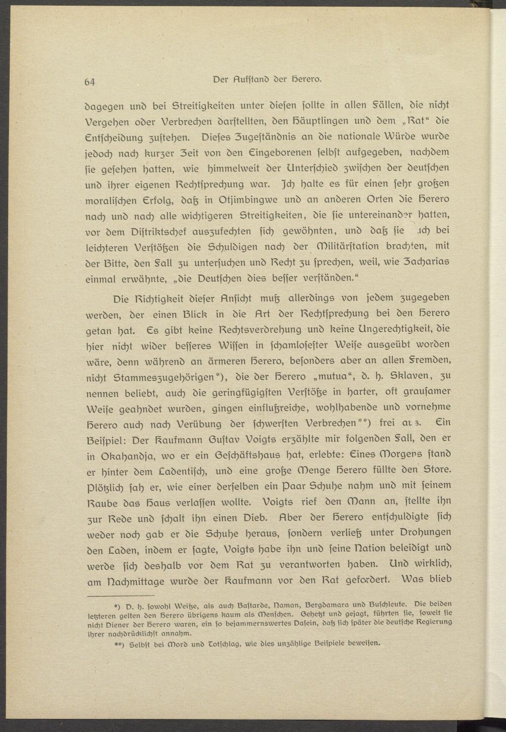 Die Dichtigkeit dieser Einsicht muß allerdings von jedem zugegeben werden, der einen Blick in die Brt der Rechtsprechung bei den löerero getan hat. Es gibt keine Bschtsvsrdrshung und keine Ungerechtigkeit, die hier nicht wider besseres Wissen in schamlosester Weiss ausgeübt worden wäre, denn während an ärmeren löerero, besonders aber an allen §remden, nicht Stammsszugehörigen*), die der löerero „mutua", d. h. Sklaven, zu nennen beliebt, auch die geringfügigsten Verstöße in harter, okt grausamer Weiss geahndet wurden, gingen einflußreiche, wohlhabende und vornehme löerero auch nach Verübung der schwersten Verbrechen") frei ars. Ein Beispiel: Der Kaufmann Sustav Voigts erzählte mir folgenden §all, den er in Okahandja, wo er ein Geschäftshaus hat, erlebte: Eines Morgens stand er hinter dem Ladentisch, und eine große Menge löerero füllte den Store, plötzlich sah er, wie einer derselben ein paar Schuhe nahm und mit seinem Baubs das löaus verlassen wollte. Voigts rief den Mann an, stellte ihn zur Bede und schalt ihn einen Dieb. Llber der löerero entschuldigte sich weder noch gab er die Schuhe heraus, sondern verließ unter Drohungen den Laden, indem er sagte, Voigts habe ihn und seine Dation beleidigt und werde sich deshalb vor dem Bat zu verantworten haben. Und wirklich, am Nachmittage wurde der Kaufmann vor den Bat getc-rdert. Was blieb