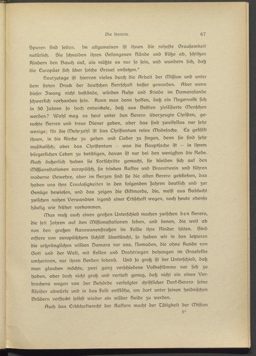 Man mutz auch einen großen Unterschied machen zwischen den herero, die seit Jahren auf den Missionsstationen leben, und denen, die weit ab von den großen harawanenstratzen im §slde ihre bindsr hüten, bind erstere von europäischem Schliff übertüncht, so haben wir in den letzteren die ursprünglichen wilden Damara vor uns, Domaden, die ohne Hunde von Sott und der XVelt, mit §ellen und Drahtringen behängen im brasfelds umherirren, nur ihren Herden lebend. Und so groß ist der Unterschied, datz man glauben möchte, zwei ganz verschiedene Volksstämme vor sich zu haben, aber doch nicht groß und vertieft genug, datz nicht ein eines Verbrechens wegen von der behörds verfolgter christlicher Dorf-Herero seine HIeider abwürfe und in das §eld entflöhe, um dort unter seinen heidnischen brüdern versteckt selbst wieder ein wilder Heide zu werden.