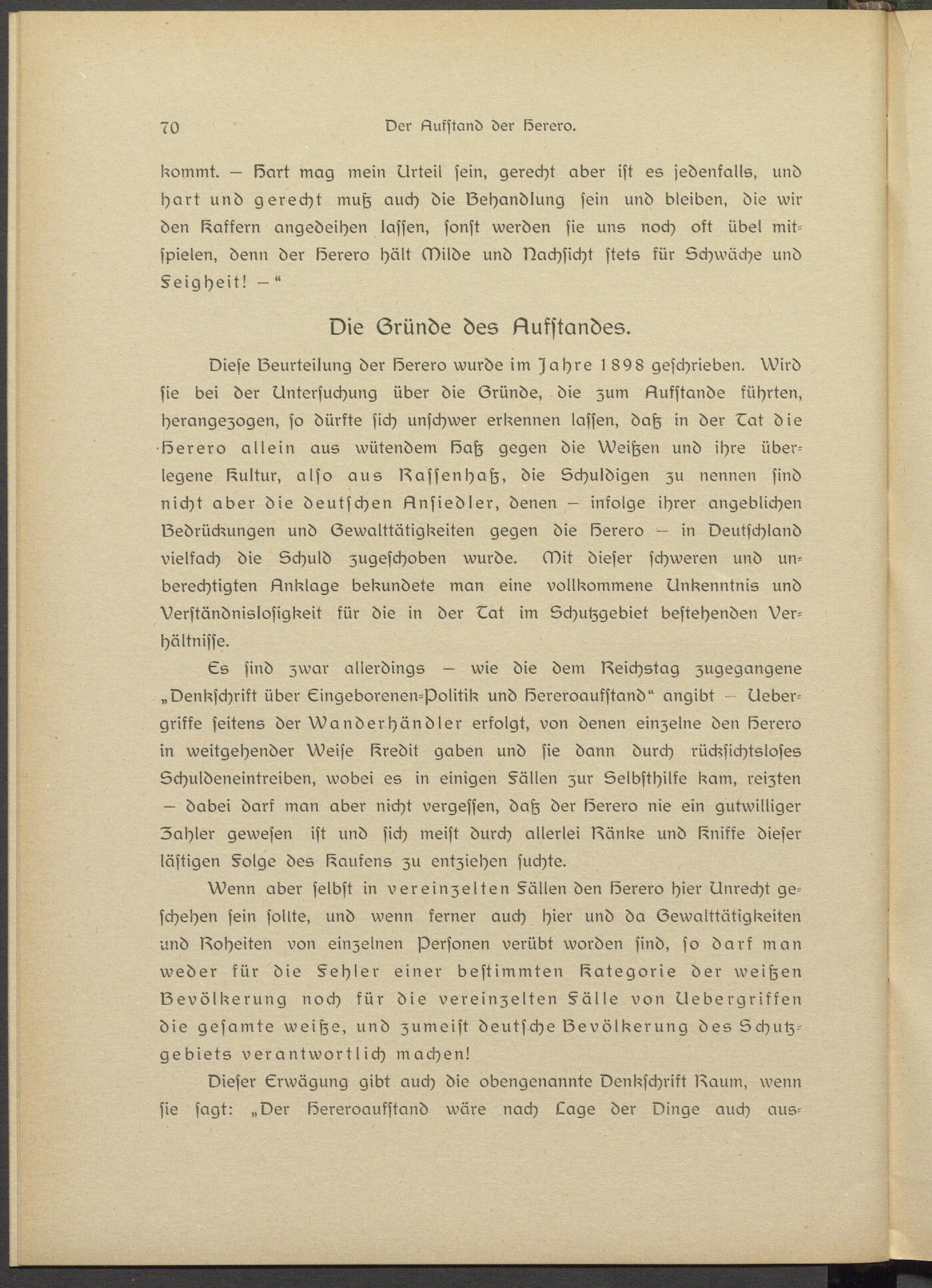 Wenn aber selbst in vereinzelten §ällsn den Berero hier Dnrscht geschehen sein sollte, und wenn ferner auch hier und da (Zewalttätigkeitsn und Boheitsn von einzelnen Personen verübt worden sind, so darf man weder für die §shlsr einer bestimmten Kategorie der wsitzen Bevölkerung noch kür die vereinzelten §älls von Oebsrgriffen die gesamte weitzs, und zumeist deutsche Bevölkerung des Schutzgebiets verantwortlich machen!