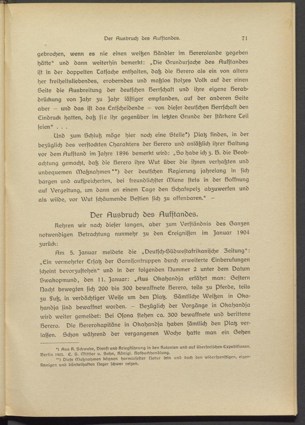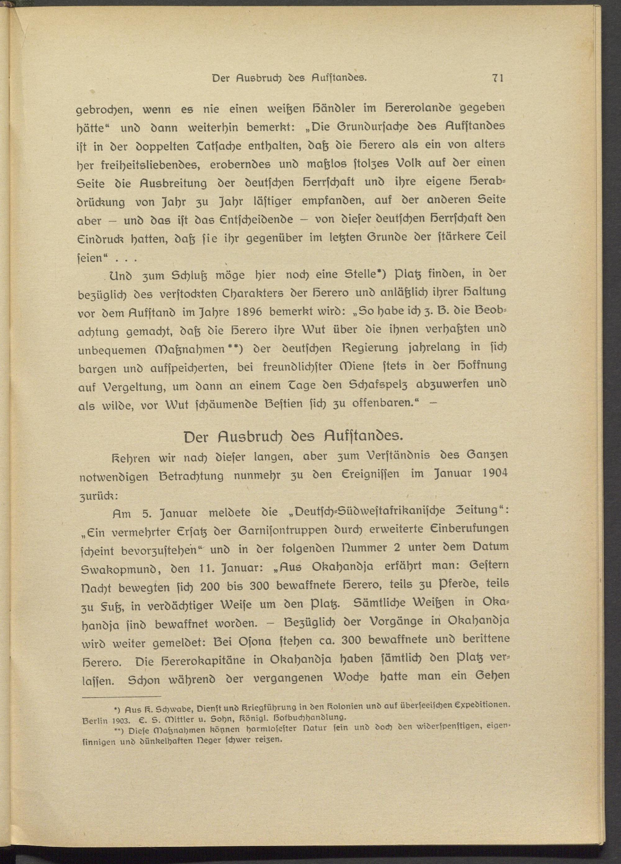 Hm 5. Januar meldete die „Deutsch-Südwestafrikanische Zeitung": „Ein vermehrter Ersatz der Garnisontruppen durch erweiterte Einberufungen scheint bevorzustehen" und in der folgenden Nummer 2 unter dem Datum Swakopmund, den II. Januar: „Hus Okahandja erfährt man: Gestern Nacht bewegten sich 200 bis 300 bewaffnete Herero, teils zu Pferde, teils zu §uh, in verdächtiger Weise um den Platz. Sämtliche Weißen in Okahandja sind bewaffnet worden. - Gezüglich der Vorgänge in Okahandja wird weiter gemeldet: Sei Osona stehen ca. 300 bewaffnete und berittene Herero. Die Hererokapitäne in Okahandja haben sämtlich den Platz verlassen. Schon während der vergangenen Woche hatte man ein Gehen