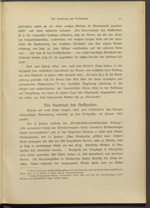 Und zum Schluß möge hier noch eine Stelle') Platz finden, in der bezüglich des verstockten Lharakters der Herero und anläßlich ihrer Haltung vor dem Hukstand im Jahrs 1896 bemerkt wird: „So habe ich z. S. die Seob- achtung gemacht, daß die Herero ihre Wut über die ihnen verhaßten und unbequemen Maßnahmen") der deutschen Legierung jahrelang in sich bargen und aufspeicherten, bei freundlichster Miene stets in der Hoffnung auf Vergeltung, um dann an einem Eage den Schafspelz abzuwerfen und als wilde, vor Wut schäumende lZsstisn sich zu offenbaren." -