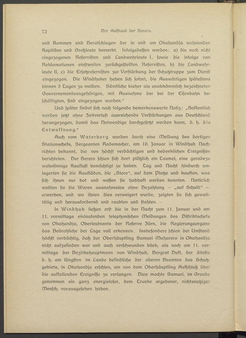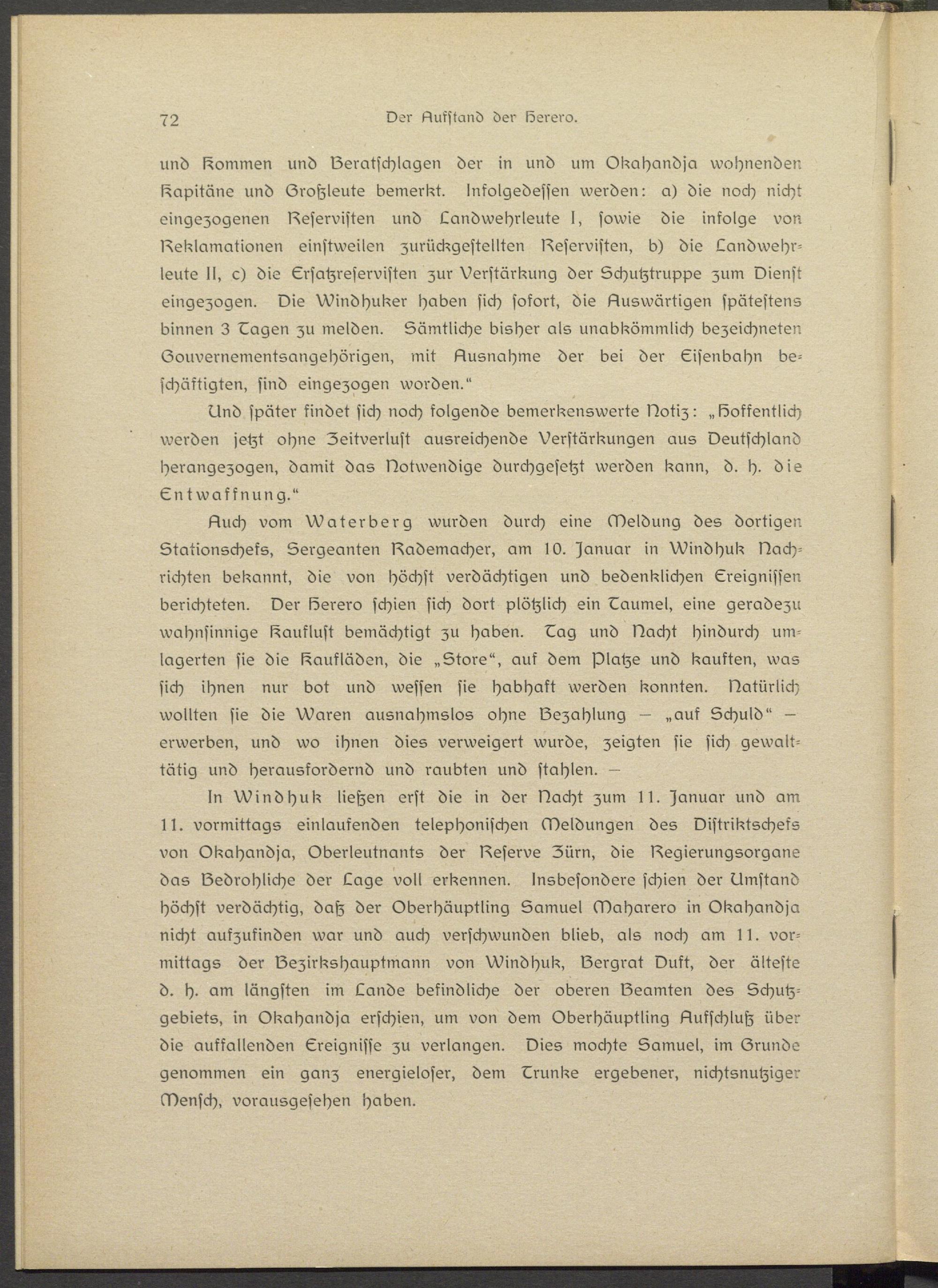 In Wind huk Netzen erst die in der Nacht zum I I. )anuar und am I I. vormittags einläutenden telephonischen Meldungen des Distriktschsks von Okahandja, Oberleutnants der Nsssrvs Zürn, die Negisrungsorgans das lZedrohliche der Lage voll erkennen. Insbesondere schien der Umstand höchst verdächtig, datz der Obsrhäuptling Samuel Maharsro in Okahandja nicht aufzufinden war und auch verschwunden blieb, als noch am II. vormittags der Sezirkshauptmann von Windhuk, Hergrat Duft, der älteste d. h. am längsten im Lande befindliche der oberen hsamtsn des Schutzgebiets, in Okahandja erschien, um von dem Oberhäuptling Llufschlutz über die auffallenden Ereignisse zu verlangen. Dies mochte Samuel, im (Zrunde genommen ein ganz energieloser, dem Drunke ergebener, nichtsnutziger Mensch, vorausgesehen haben.