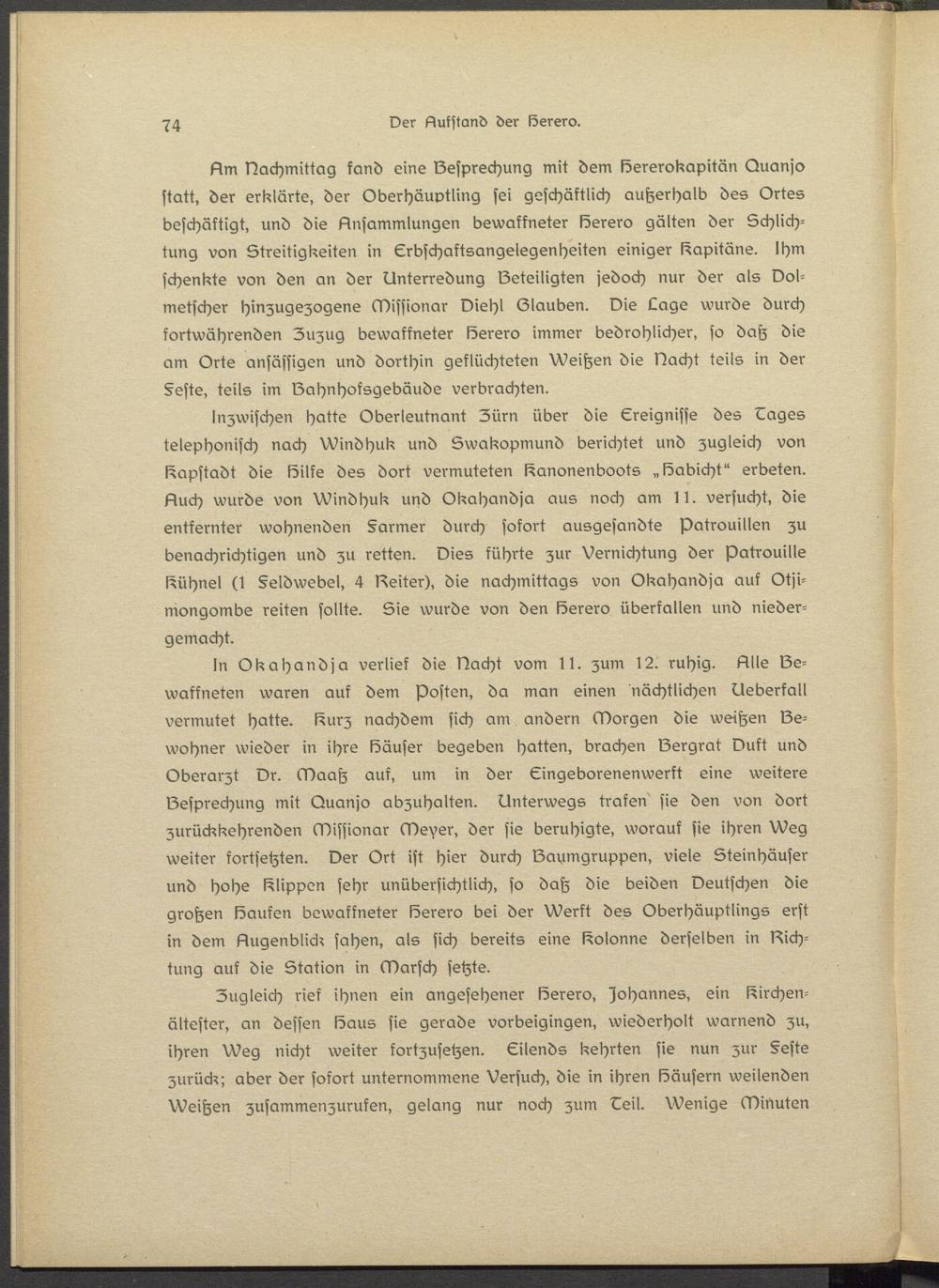 6m Nachmittag fand eins Besprechung mit dem Bererokapitän Quanjo statt, der erklärte, der Oberhäuptling sei geschäftlich außerhalb des Ortes beschäftigt, und die Ansammlungen bewaffneter Berero gälten der Schlichtung von Streitigkeiten in Erbschaktsangelsgenheiten einiger Kapitäne. Ihm schenkte von den an der Unterredung Beteiligten jedoch nur der als Dolmetscher hinzugezogene Missionar Diehl Olauben. Die Lage wurde durch fortwährenden Zuzug bewaffneter Bersro immer bedrohlicher, so daß die am Orte ansässigen und dorthin geklüchteten Weißen die Dacht teils in der §ests, teils im Bahnhofsgebäude verbrachten.