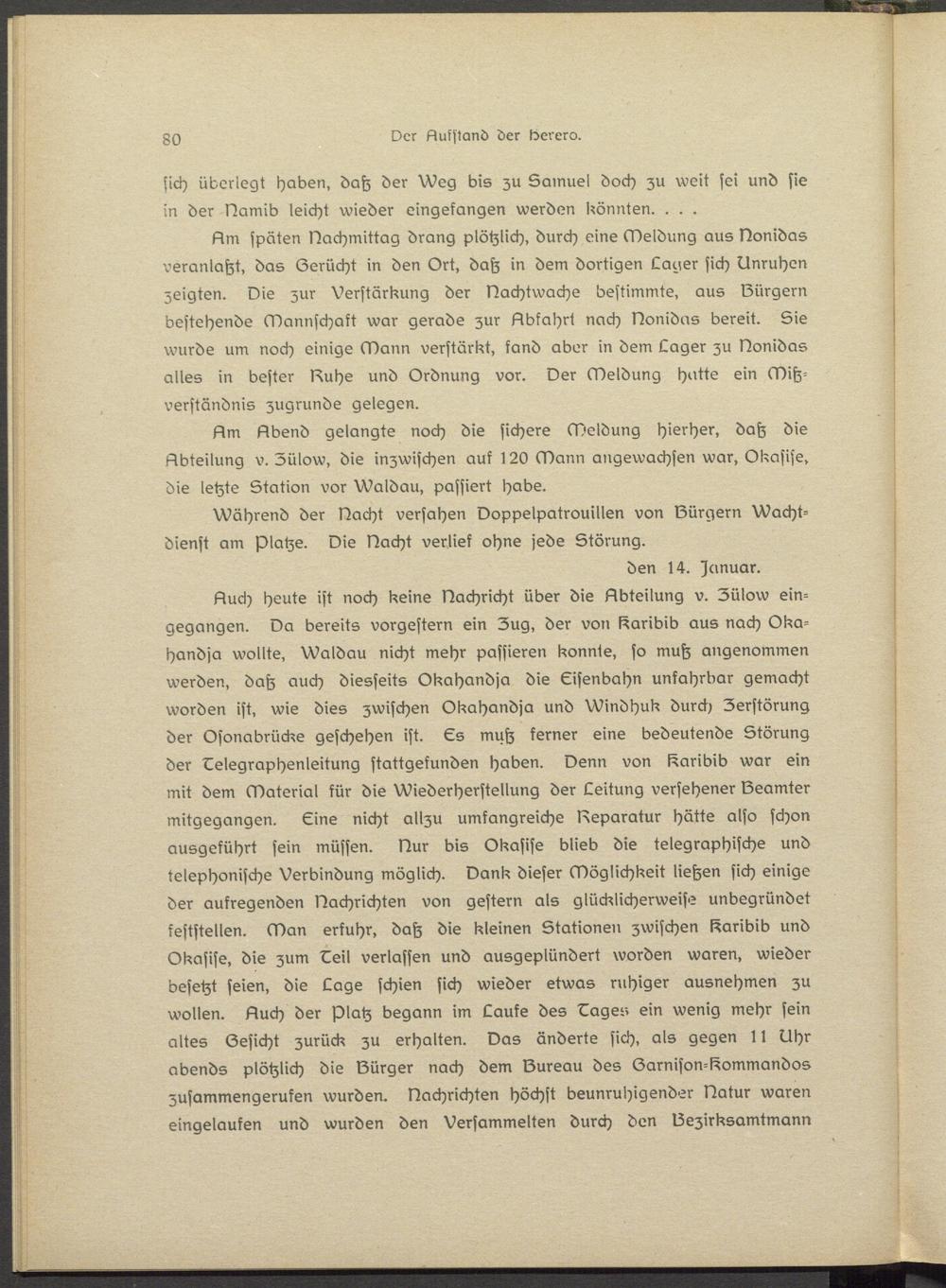 Nuch heute ist noch keine Nachricht über die Abteilung v. Zülow eingegangen. Na bereits vorgestern ein Zug, der von ßaribib aus nach Okahandja wollte, Waldau nicht mehr passieren konnte, so mutz angenommen werden, datz auch diesseits Okahandja die Eisenbahn unkahrbar gemacht worden ist, wie dies zwischen Okahandja und Windhuk durch Zerstörung der Osonabrücks geschehen ist. Es mutz ferner eine bedeutende Störung der Telegraphenleitung stattgefunden haben. Denn von ßaribib war ein mit dem Material kür die Wiederherstellung der Leitung versehener Seamter mitgegangen. Eine nicht allzu umfangreiche Reparatur hätte also schon ausgeführt sein müssen, pur bis Okasise blieb die telegraphische und telephonische Verbindung möglich. Dank dieser Möglichkeit ließen sich einige der aufregenden Nachrichten von gestern als glücklicherweise unbegründet feststellen. Man erfuhr, datz die kleinen Stationen zwischen Karibik und Okasise, die zum peil verlassen und ausgeplündert worden waren, wieder besetzt seien, die Lage schien sich wieder etwas ruhiger ausnehmen zu wollen. Nuch der Platz begann im Laufe des Eages ein wenig mehr sein altes Gesicht zurück zu erhallen. Das änderte sich, als gegen 11 Llhr abends plötzlich die Sürger nach dem pureau des Garnison-Kommandos zusammengerufen wurden. Nachrichten höchst beunruhigender Natur waren eingelaufen und wurden den Versammelten durch den Gezirksamtmann