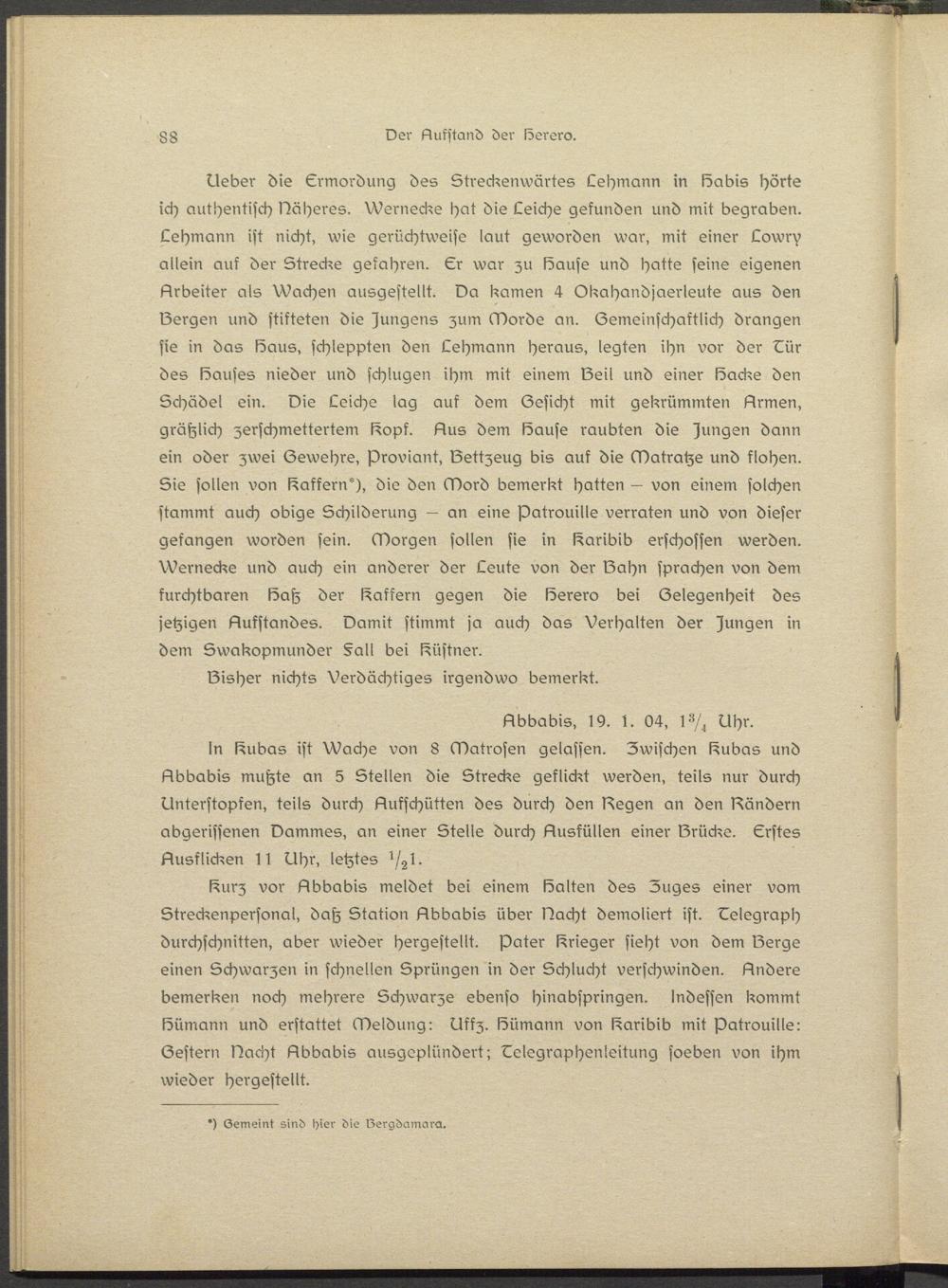 Ueber die Ermordung des Strscksnwärtes Lehmann in Sabis hörte ich authentisch Dähsrss. Wsrnscks Hot die Leiche gefunden und mit begraben. Lehmann ist nicht, wie gsrüchtweise laut geworden war, mit einer Lowrv allein auf der Strecke gefahren. Er war zu Sause und hatte seine eigenen Srbeiter als Wachen ausgestellt. Da kamen 4 Okahandjasrlsuts aus den Sergen und stifteten die )ungens zum Morde an. Gemeinschaftlich drangen sie in das Saus, schleppten den Lehmann heraus, legten ihn vor der Eür des Sauses nieder und schlugen ihm mit einem Seil und einer löacks den Schädel ein. Die Leiche lag auf dem Gesicht mit gekrümmten Llrmen, gräßlich zerschmettertem l^opf. Sus dem Sause raubten die ssungsn dann ein oder zwei Gewehrs, Proviant, Settzeug bis auf die Matratze und flohen. Sie sollen von Raffern'), die den Mord bemerkt hatten — von einem solchen stammt auch obige Schilderung — an eine Patrouille verraten und von dieser gefangen worden sein. Morgen sollen sie in ßaribib erschossen werden. Wernecke und auch ein anderer der Leute von der Sahn sprachen von dem furchtbaren Satz der Raffern gegen die Ssrero bei Gelegenheit des jetzigen Liukstandss. Damit stimmt ja auch das Verhalten der )ungsn in dem Swakopmunder §a» bei k^üstner.
