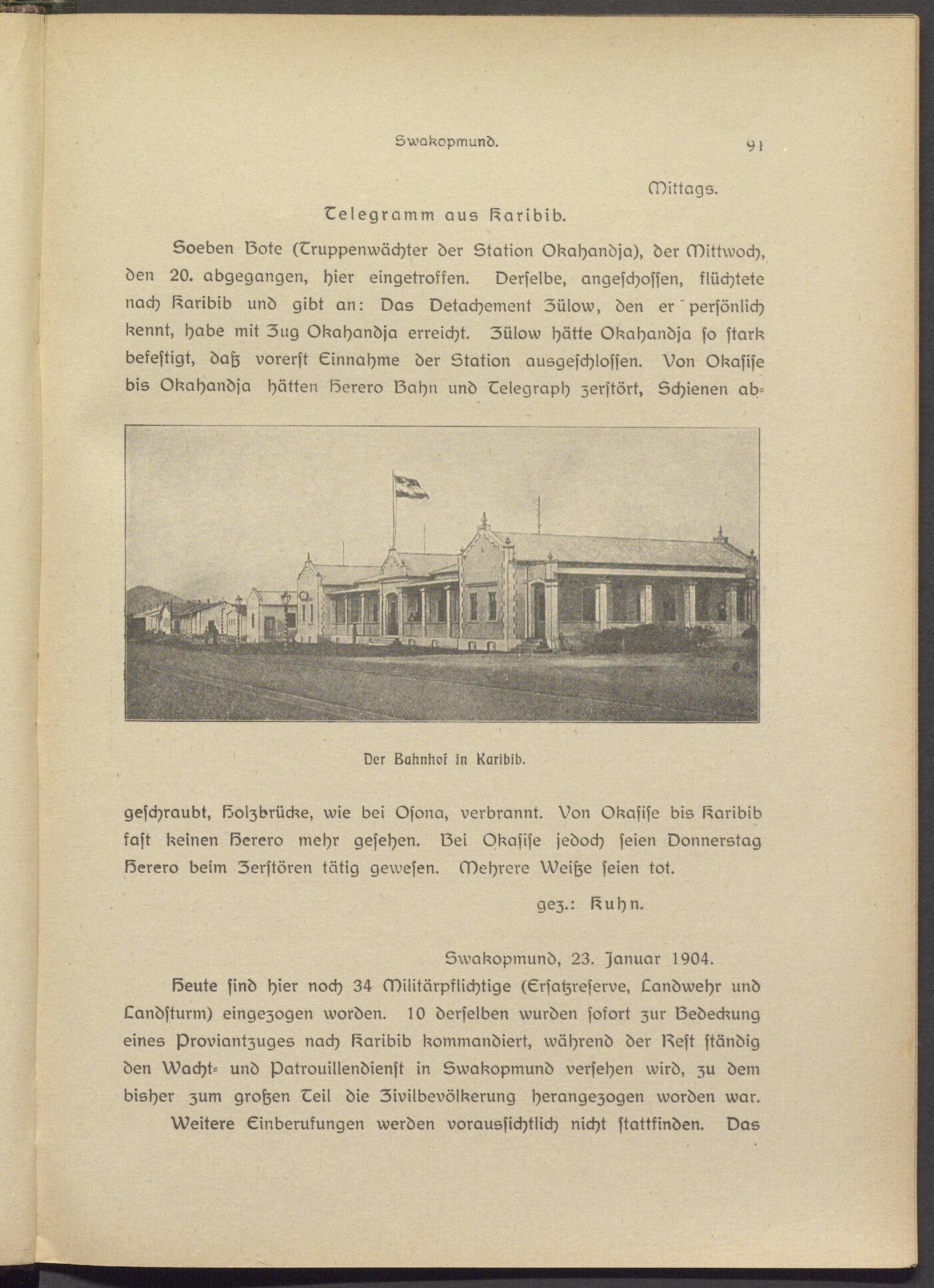 Soeben Sote (Eruppsnwächtsr der Station Okahandja), der Mittwoch, den 20. abgegangen, hier eingetroffen. Derselbe, angeschossen, flüchtete nach karibib und gibt an: Das Dstachement Zülow, den er ' persönlich kennt, Habs mit Zug Okahandja erreicht. Zülow hätte Okahandja so stark befestigt, daß vorerst Einnahme der Station ausgeschlossen. Von Okasiss bis Okahandja hätten Sersro Sahn und Eelegraph zerstört, Schienen ab-
