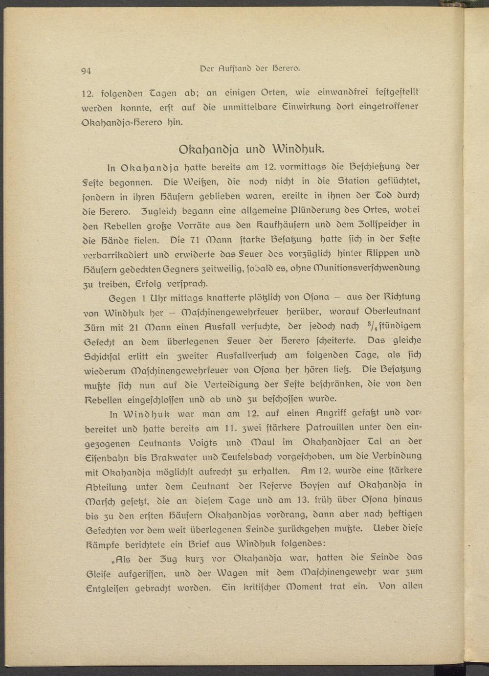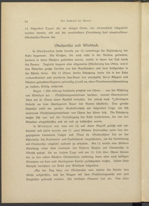 In Windhuk war man am 12. auf einen Angriff gefaßt und vorbereitet und hatte bereits am 11. zwei stärkere Patrouillen unter den eingezogenen Leutnants Voigts und Maul im Okahandjasr Eal an der Eisenbahn bis Grakwater und Eeukelsbach vorgeschoben, um die Verbindung mit Okahandja möglichst aufrecht zu erhalten. Am 12. wurde eine stärkere Abteilung unter dem Leutnant der Reserve Soffen auf Okahandja in Marsch gesetzt, die an diesem Eags und am 13. früh über Osona hinaus bis zu den ersten Zäussrn Okahandjas vordrang, dann aber nach heftigen Gefechten vor dem weit überlegenen §einds zurückgehen mutzte. Lieber diese Zämpfe berichtete ein IZrief aus Windhuk folgendes: