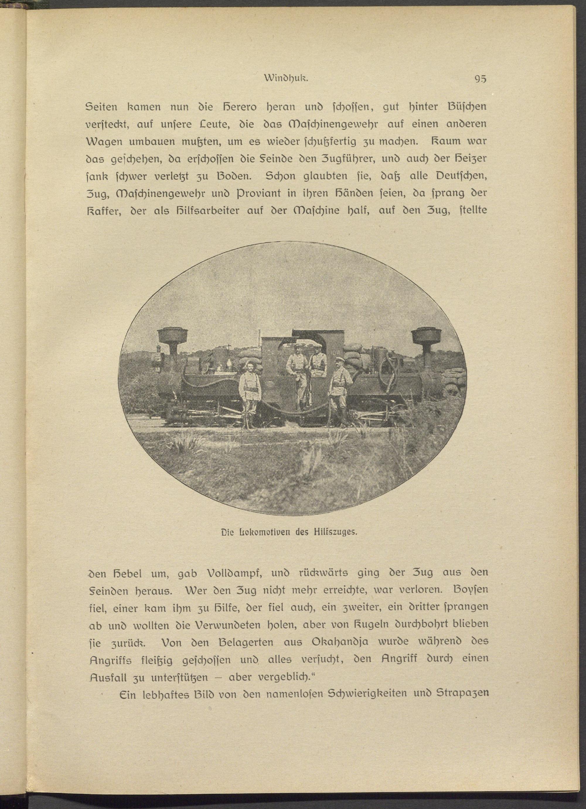 Leiten kamen nun die löerero heran und schassen, gut hinter lZüschen versteckt, aut unsers Leute, die das Maschinengewehr auf einen anderen Wagen umbauen mutzten, um es wieder schutzfertig zu machen, Saum war das geschehen, da erschossen die §einde den Zugführer, und auch der Leizer sank schwer verletzt zu Soden. Schon glaubten sie, datz alle Deutschen, Zug, Maschinengewehr und Proviant in ihren Länden seien, da sprang der Laffer, der als Lilfsarbeiter auf der Maschine half, auf den Zug, stellte
