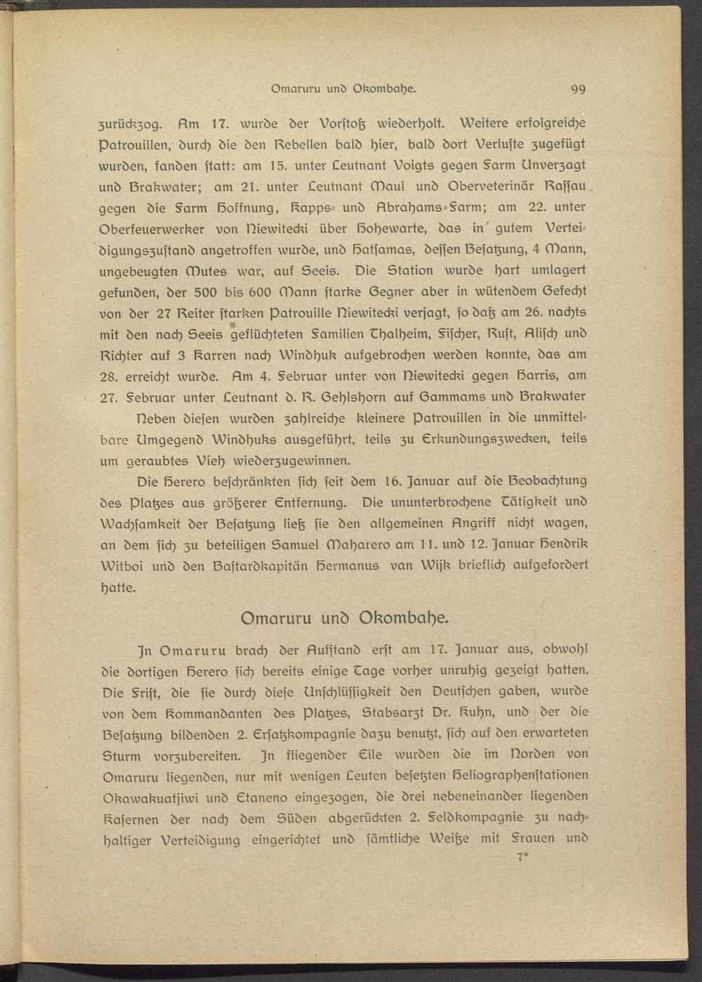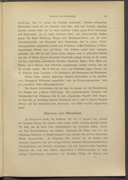 Die löerero beschränkten sich seit dem 16. Januar auf die IZeobachtung des Platzes aus größerer Entfernung. Die ununterbrochene Tätigkeit und Wachsamkeit der IZesatzung ließ sie den allgemeinen 6ngriff nicht wagen, an dem sich zu beteiligen Samuel Maharero am 11. und 12. Januar lösndrik Witboi und den IZastardkapitän lösrmanus van Wijk brieflich aufgefordert hatte.