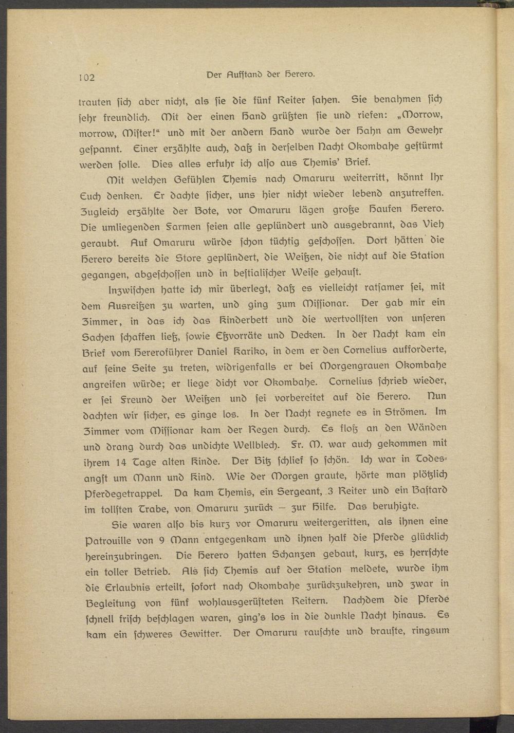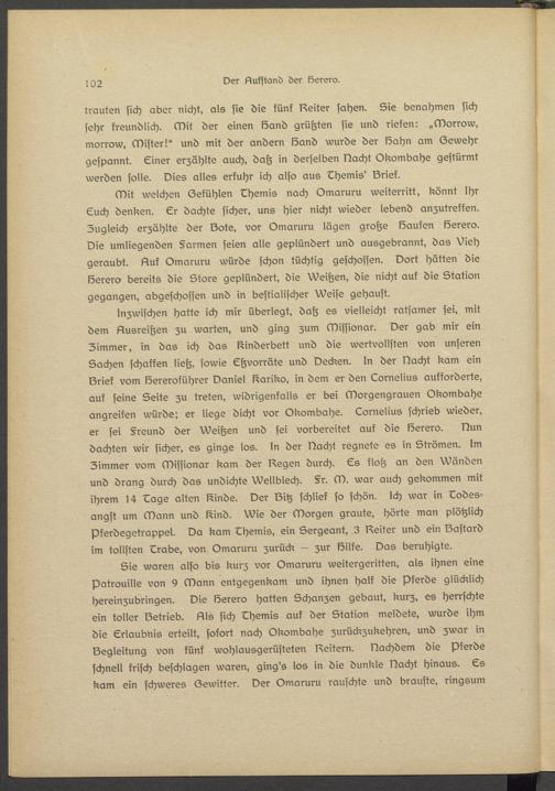 trauten sich aber nicht, als sie die fünf weiter sahen. Sie benahmen sich sehr freundlich. Mit der einen Band grüßten sie und rieten: „Morrow, morrow, Mister!" und mit der andern Band wurde der Bahn am Oewehr gespannt. Einer erzählte auch, daß in derselben Nacht Okombahs gestürmt werden solle. Nies alles erkuhr ich also aus Bhsmis' Brist.