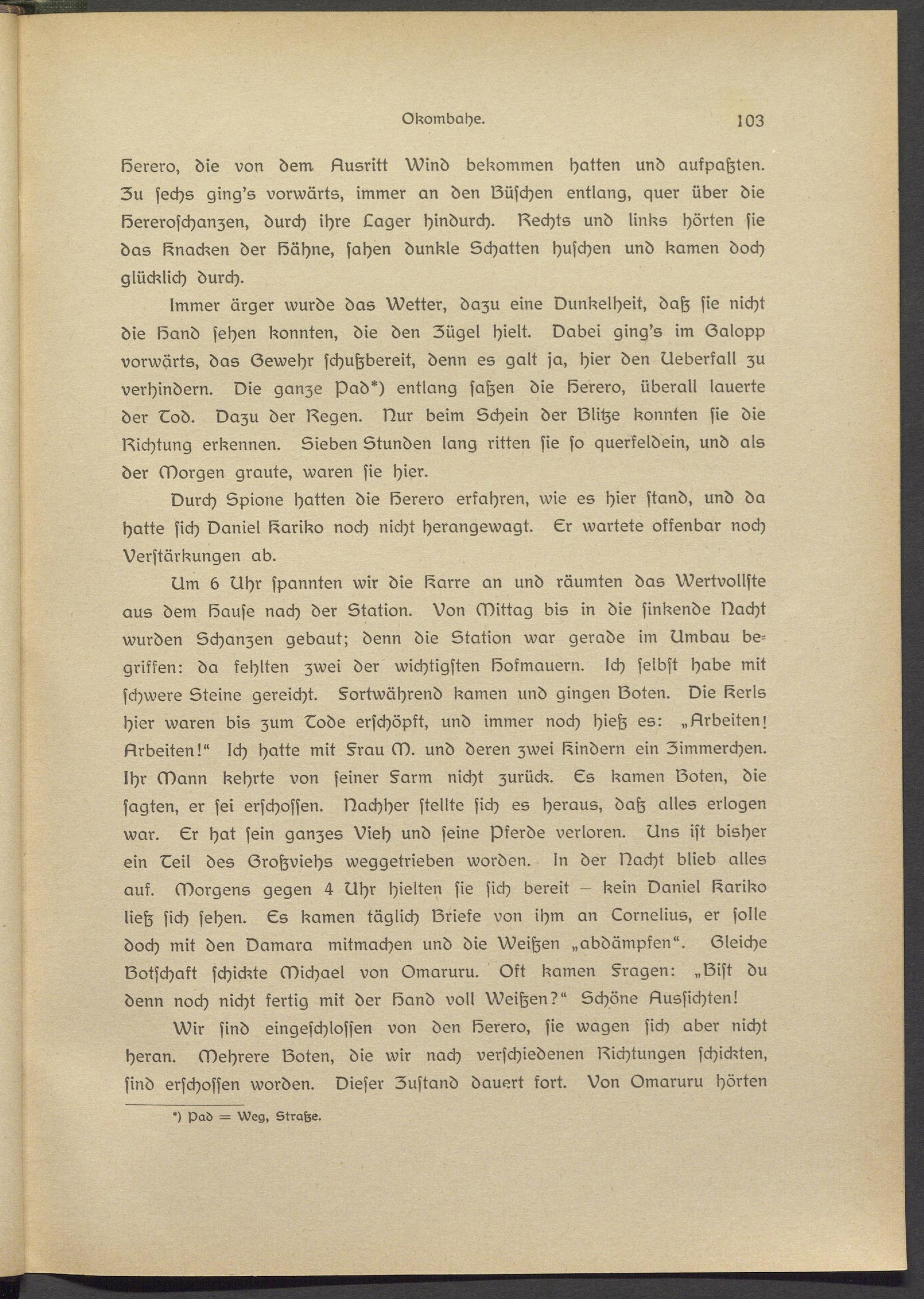 Immer ärger wurde das Wetter, dazu eins Dunkelheit, daß sie nicht die Sand sehen konnten, die den Zügel hielt. Dabei ging's im Salopp vorwärts, das Sswshr schußbereit, denn es galt ja, hier den Ueberkall zu verhindern. Die ganze pad*) entlang saßen die Serero, überall lauerte der Lod. Dazu der Asgen. Dur beim Schein der IZlitze konnten sie die Dichtung erkennen. Sieben Stunden lang ritten sie so querfeldein, und als der Morgen graute, waren sie hier.