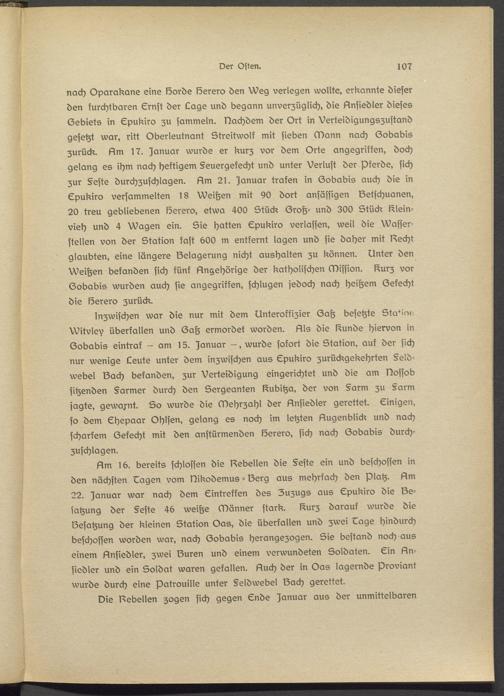 Inzwischen war die nur mit dem Unteroffizier Sah besetzte Stuba» Witvlev überfallen und Gah ermordet worden. Als die Hunde hiervon in Oobabis eintraf - am 15. )anuar -, wurde sofort die Station, auk der sich nur wenige Leute unter dem inzwischen aus Epukiro zurückgekehrten §sld- wsbsl Bach befanden, zur Verteidigung eingerichtet und die am Uossob sitzenden §armer durch den Sergeanten Hubitza, der von §arm zu §arm jagte, gewannt. So wurde die Mehrzahl der Ansiedler gerettet. Einigen, so dem Ehepaar OHIssn, gelang es noch im letzten Augenblick und nach scharfem Gekecht mit den anstürmenden köerero, sich nach (Zobabis durchzuschlagen.