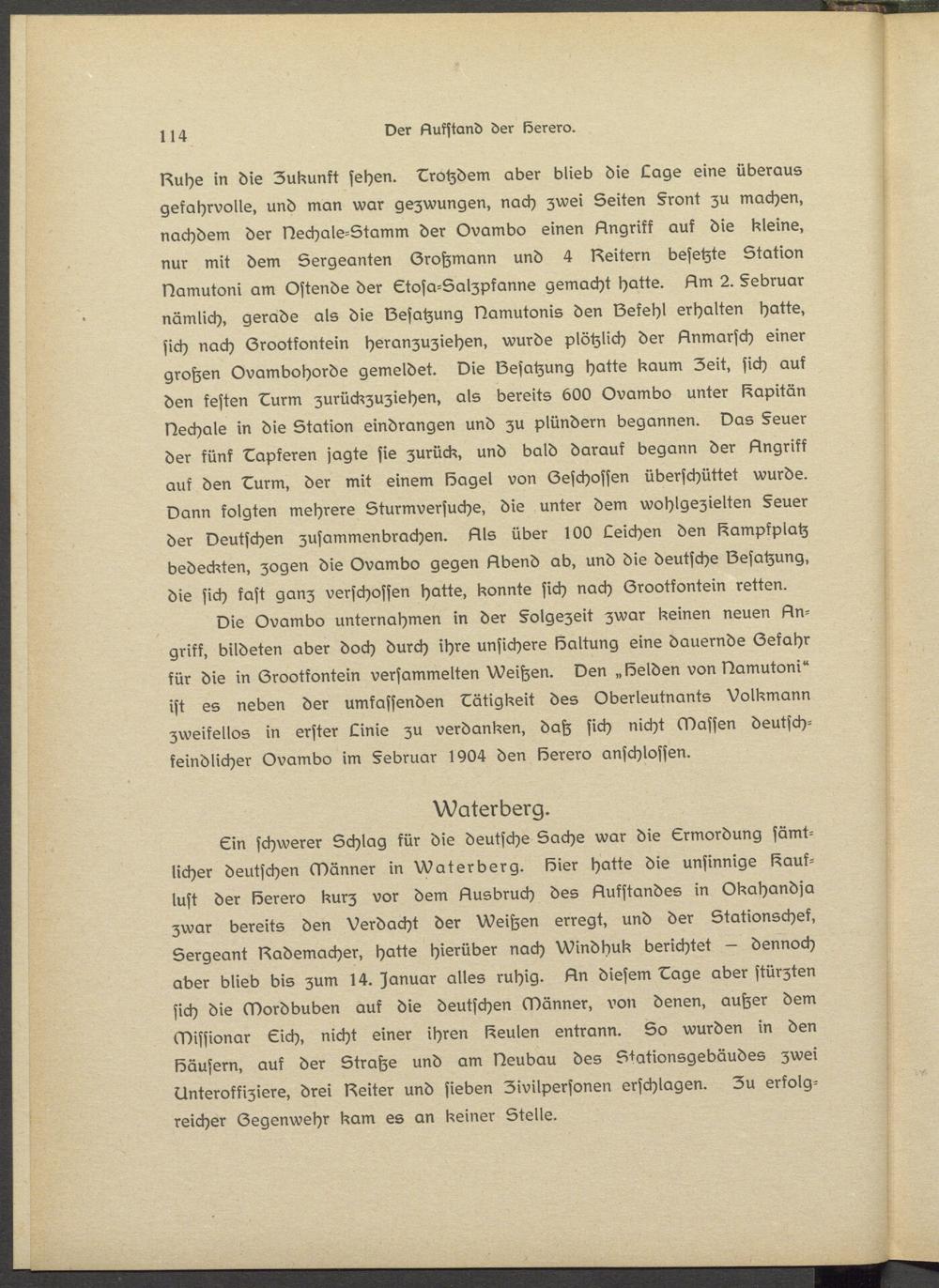 Sin schwerer Schlag für die deutsche Sache war die Ermordung sämtlicher deutschen Männer in Waterberg. Sier hatte die unsinnige Kauflust der Serero kurz vor dem Nusbruch des Nufstandes in Okahandja zwar bereits den Verdacht der Weißen erregt, und der Stationschef, Sergeant Nademachsr, hatte hierüber nach Windhuk berichtet - dennoch aber blieb bis zum 14. Januar alles ruhig. Nn diesem Lage aber stürzten sich die Mordbuben auf die deutschen Männer, von denen, außer dem Missionar Sich, nicht einer ihren Seulsn entrann. So wurden in den Säusern, auf der Straße und am Neubau des Stationsgebäudes zwei Unteroffiziere, drei Neiter und sieben Zivilpersonen erschlagen. Zu erfolgreicher (Zegenwehr kam es an keiner Stelle.