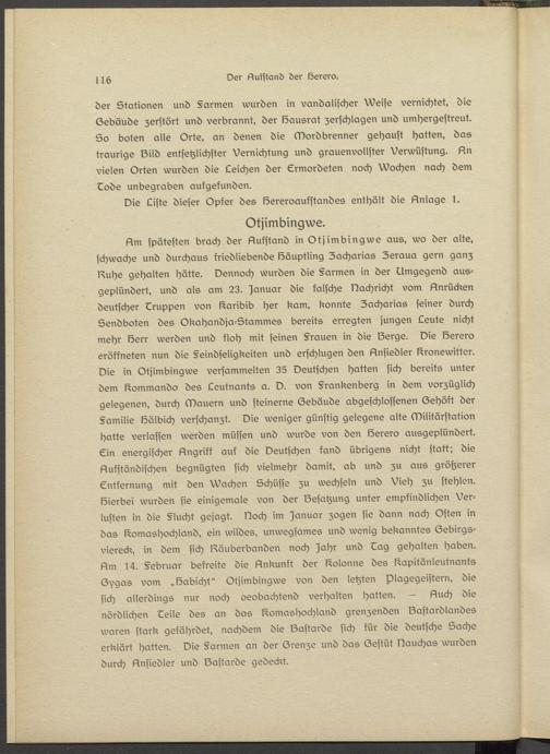 der Stationen und Farmen wurden in vandalischer Weiss vernichtet, die Gebäude zerstört und verbrannt, der Sausrat zerschlagen und umhergestreut. So boten alle Orte, an denen die Mordbrenner gehaust hatten, das traurige Bild entsetzlichster Vernichtung und grauenvollster Verwüstung. Dn vielen Orten wurden die Leichen der Ermordeten noch Wochen nach dem Dode unbegraben aufgefunden.