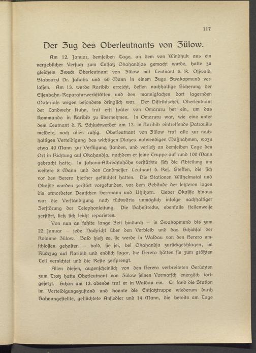 Am 12. Januar, demselben Lage, an dem von XVindhuk aus ein vergeblicher Versuch zum Entsatz Okahandjas gemacht wurde, hatte zu gleichem Zweck Oberleutnant von Zülow mit Leutnant d. A. Osswald, Stabsarzt Dr. Jakobs und 60 Mann in einem Zuge Swakopmund verlassen. Am 13. wurde ßaribib erreicht, dessen nachhaltige Sicherung der Eisenbahn-Asparaturwsrkstättsn und des mannigfachen dort lagernden Materials wegen besonders dringlich war. Der Distriktschsk, Oberleutnant der Landwehr Fuhr», trat erst später von Omaruru her ein, um das Kommando in ^aribib zu übernehmen. In Omaruru war, wie eine unter dem Leutnant d. A. Schluckwerder am 13. in l^aribib eintreffende Patrouille meldete, noch alles ruhig. Oberleutnant von Zülow traf alle zur nachhaltigen Verteidigung des wichtigen Platzes notwendigen Matznahmen, wozu etwa 40 Mann zur Verfügung standen, und verließ an demselben Lage den Ort in Dichtung auf Okahandja, nachdem er seine Lruppe auf rund 100 Mann gebracht hatte. In lohann-Albrschtshöhs verstärkte sich die Abteilung um weitere 8 Mann und den Landmesser Leutnant d. Aes. Steffen, die sich vor den köerero hierher geflüchtet hatten. Die Stationen Wilhslmsta! und Okasise wurden zerstört vorgefunden, vor dem Oebäuds der letzteren lagen die ermordeten Deutschen köerrmann und Uhlhorn. Ueber Okasise hinaus war die Verständigung nach rückwärts unmöglich infolge nachhaltiger Zerstörung der Lelephonleitung. Die IZahnstrecks, ebenfalls stellenweise zerstört, lieh sich leicht reparieren.