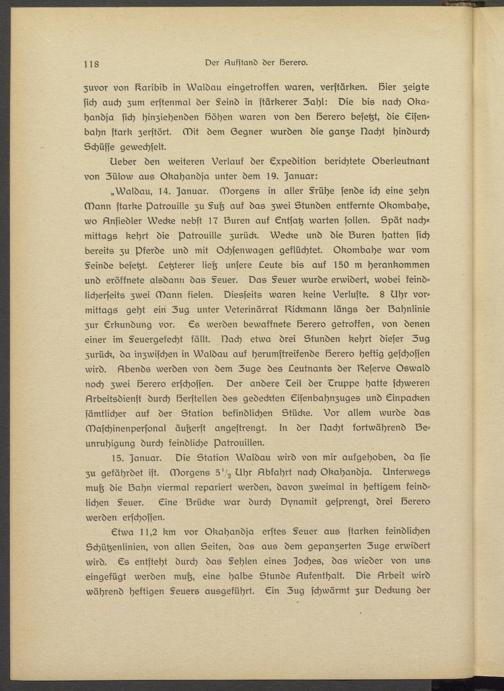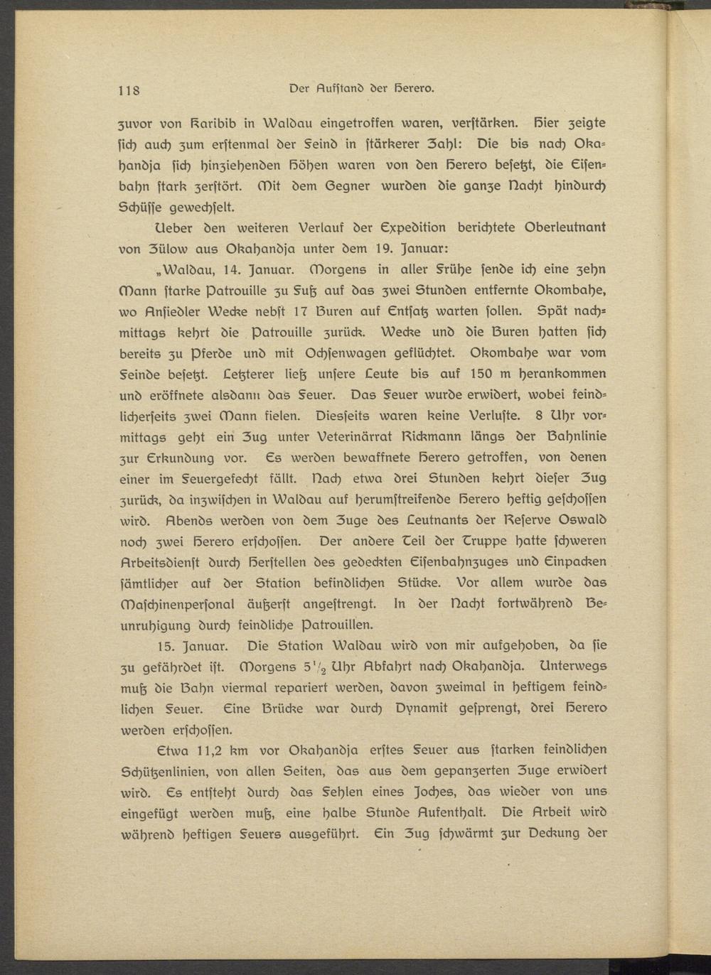 15. Januar. Die Station Waldau wird von mir aufgehoben, da sie zu gefährdet ist. Morgens 5 "2 Uhr Abfahrt nach Okahandja. Unterwegs muh die Sahn viermal repariert werden, davon zweimal in heftigem feindlichen Feuer. Eine Brücke war durch Dynamit gesprengt, drei Serero werden erschossen.