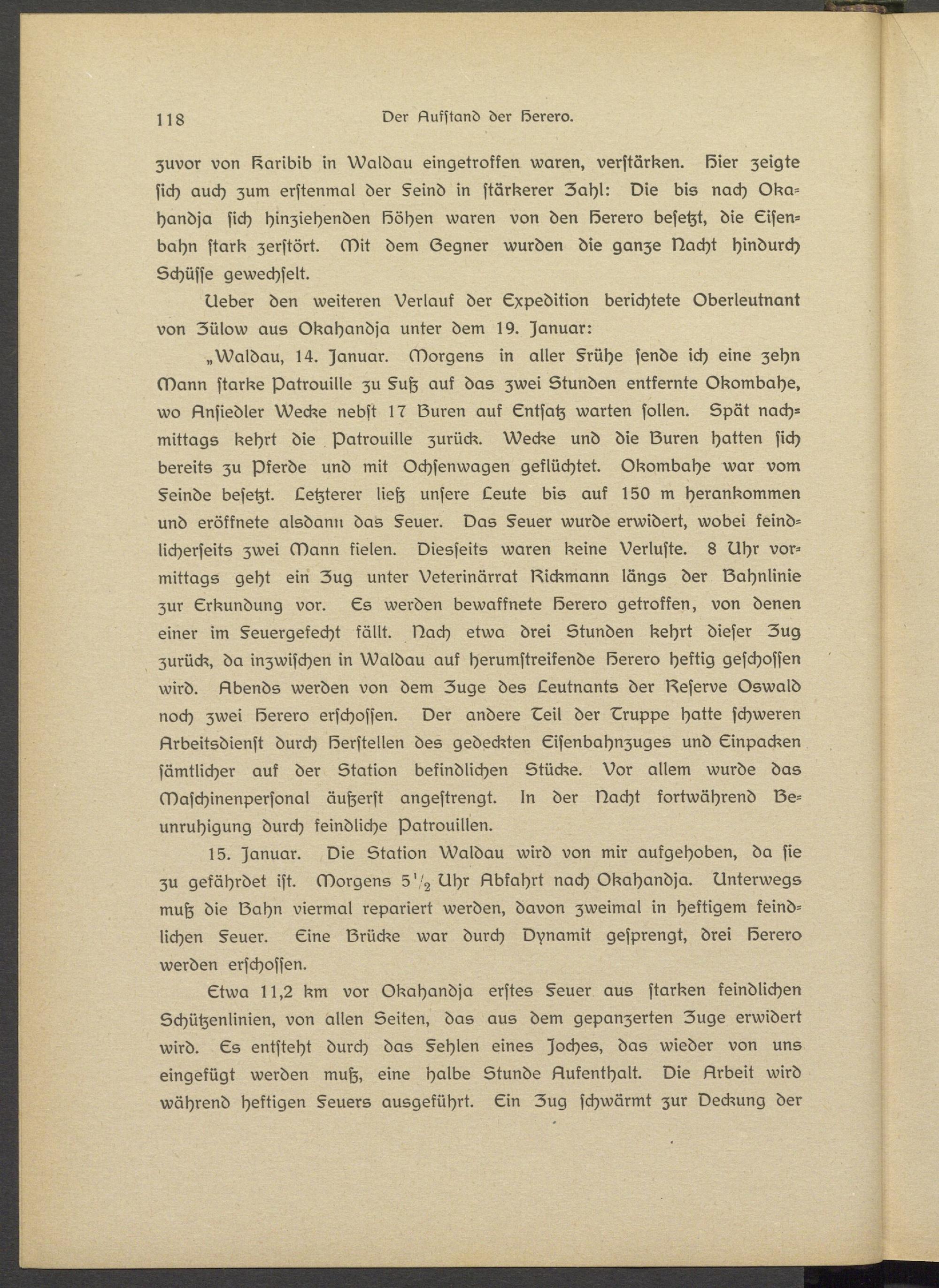 »Waldau, 14. Januar. Morgens in aller Frühe sende ich eine zehn Mann starke Patrouille zu §uh auf das zwei Stunden entkernte Okombahs, wo Ansiedler Wecke nebst 17 Suren auf Entsatz warten sollen. Spät nachmittags kehrt die Patrouille zurück. Wecke und die Suren hatten sich bereits zu Pferds und mit Ochsenwagsn geflüchtet. Okombahs war vom Feinde besetzt. Letzterer lieh unsere Leute bis auf 150 m herankommen und eröffnete alsdann das Feuer. Das Feuer wurde erwidert, wobei ksind- licherseits zwei Mann fielen. Diesseits waren keine Verluste. 8 Uhr vormittags geht ein Zug unter Veterinärrat Sickmann längs der Sahnlinie zur Erkundung vor. Es werden bewaffnete Ssrero getroffen, von denen einer im Fsuergekecht fällt. Dach etwa drei Stunden kehrt dieser Zug zurück, da inzwischen in Waldau auf herumstreifende Ssrero heftig geschossen wird. Abends werden von dem Zuge des Leutnants der Ssservs Oswald noch zwei Ssrero erschossen. Der andere Lsil der Eruppe hatte schweren Arbeitsdienst durch Serstellen des gedeckten Eissnbahnzugss und Einpacken sämtlicher auk der Station befindlichen Stücks. Vor allem wurde das Maschinenpersonal äußerst angestrengt. In der Sacht fortwährend Beunruhigung durch feindliche Patrouillen.