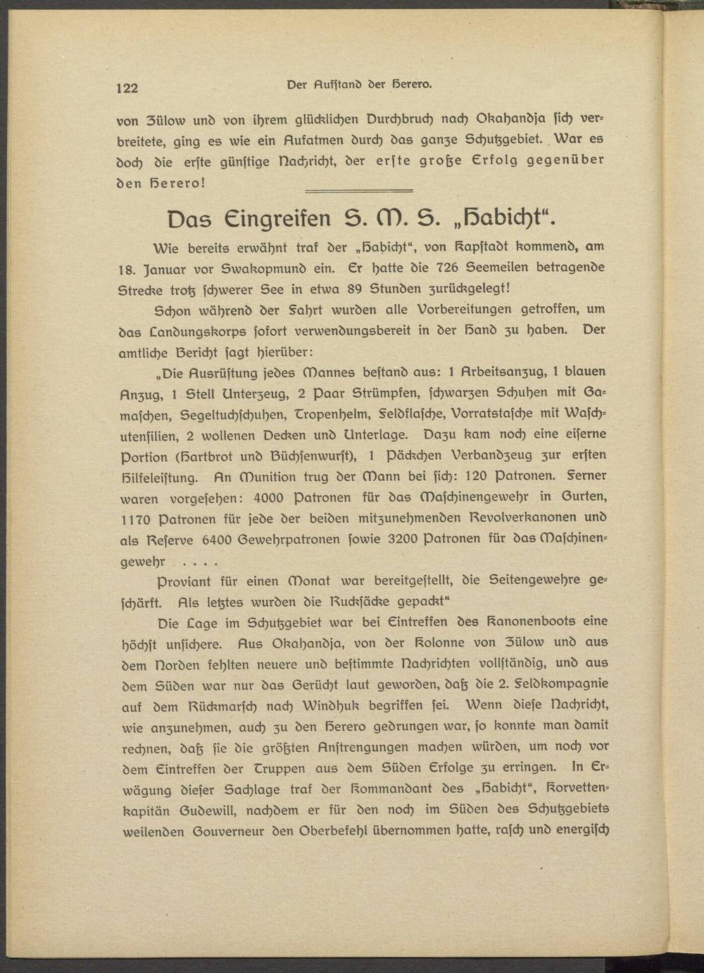 Die Lage im Schutzgebiet war bei Eintreffen des Kanonenboots eine höchst unsichere. Llus Okahandja, von der Kolonne von Zülow und aus dem Norden kehlten neuere und bestimmte Nachrichten vollständig, und aus dem Süden war nur das Gerücht laut geworden, dah die 2. §eldkompagnie auk dem Rückmarsch nach Windhuk begriffen sei. Wenn diese Nachricht, wie anzunehmen, auch zu den Serero gedrungen war, so konnte man damit rechnen, dah sie die größten Anstrengungen machen würden, um noch vor dem Eintreffen der Eruppen aus dem Süden Erfolge zu erringen. In Erwägung dieser Sachlage traf der Kommandant des „Sabicht", Korvettenkapitän Gudewill, nachdem er für den noch im Süden des Schutzgebiets weilenden Gouverneur den Oberbefehl übernommen hatte, rasch und energisch