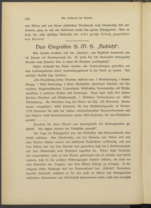 „Die Ausrüstung jedes Mannes bestand aus: 1 Llrbsitsanzug, 1 blauen Llnzug, 1 Stell Unterzeug, 2 paar Strümpfen, schwarzen Schuhen mit 6a- maschen, Segeltuchschuhen, Tropenhelm, §eldtlasche, Vorratstasche mit Wasch- utensilien, 2 wollenen Decken und Unterlage. Dazu kam noch eine eiserne Portion (Saribrot und Süchssnwurst), I Päckchen Verbandzeug zur ersten Silkeleistung. Lln Munition trug der Mann bei sich: 120 Patronen. §erner waren vorgesehen: 4000 Patronen für das Maschinengewehr in Gurten, 1170 Patronen für jede der beiden mitzunehmenden I^evolverkanonsn und als Reserve 6400 Sewehrpatronen sowie 3200 Patronen für das Maschinengewehr ....