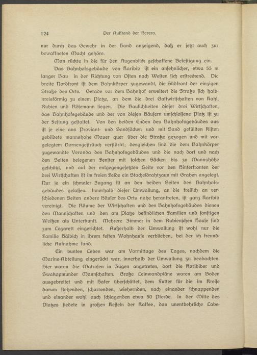 Das Bahnhofsgebäude von Saribib ist ein ansehnlicher, etwa 55 in langer Bau in der Bichtung von Osten nach besten sich erstreckend. Die breite Bordfront ist dem Bahnkörper zugewandt, die Südkront der einzigen Straße des Orts. Berade vor dem Bahnhof erweitert die Straße sich halbkreisförmig zu einem Platze, an dem die drei Bastwirtschaften von Sahl, Bubien und Bössmann liegen. Die Baulichkeiten dieser drei Wirtschaften, das Bahnhofsgebäude und der von diesen Bäusern umschlossene Platz ist zu der §sstung gestaltet. Von den beiden Enden des Bahnhofsgebäudes aus ist je eine aus Proviant- und Bandsäcken und mit Band gefüllten leisten gebildete mannshohe Mauer quer über die Straße gezogen und mit vorgelegtem Oornsngssträuch verstärkt; desgleichen sind die dem Bahnkörper zugewandte Veranda des Bahnhofsgebäudes und die nach dort und nach den Seiten bslegsnsn §snster mit solchen Säcken bis zu Mannshöhe geschützt, und auf der entgegengesetzten Seite vor den Hinterfronten der drei Wirtschaften ist im freien §elde ein Stacheldrahtzaun mit Braben angelegt. Nur je ein schmaler Zugang ist an den beiden Seiten des Bahnhofsgebäudes gelassen. Innerhalb dieser Umwallung, an die freilich an verschiedenen Seiten anders Bäuser des Orts nahe herantreten, ist ganz Saribib vereinigt. Die Bäume der Wirtschaften und des Bahnhofsgebäudes dienen den Mannschaften und den am Platze befindlichen §amilien und sonstigen Weitzen als Unterkunft. Mehrere Zimmer in dem Bubisnschen Sause sind zum Lazarett eingerichtet. Außerhalb der Umwallung ist wohl nur die ffamilie Bälbich in ihrem festen Wohnhause verblieben, bei der ich freundliche Aufnahme fand.