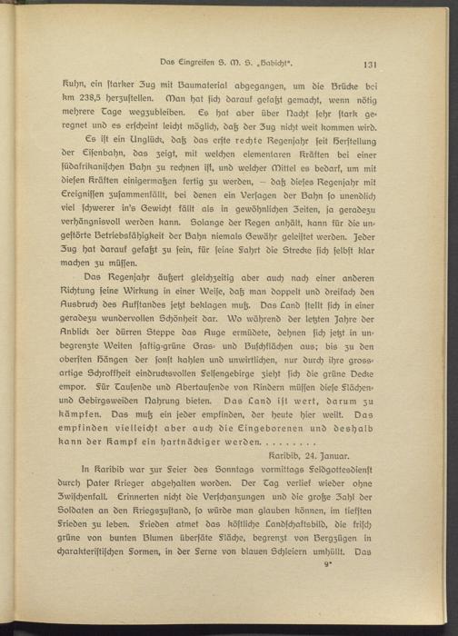 In Saribib war zur §e!er des Sonntags vormittags §eldgottesdisnst durch Pater Srieger abgehalten worden. Der Lag verlief wieder ohne Zwischenkall. Erinnerten nicht die Verschanzungen und die große Zahl der Soldaten an den Sriegszustand, so würde man glauben können, im tiefsten §risdsn zu leben. §risden atmet das köstliche Landschaftsbild, die frisch grüne von bunten IZIumen übersäte §läche, begrenzt von Gergzügsn in charakteristischen §ormen, in der §erne von blauen Schleiern umhüllt. Das
