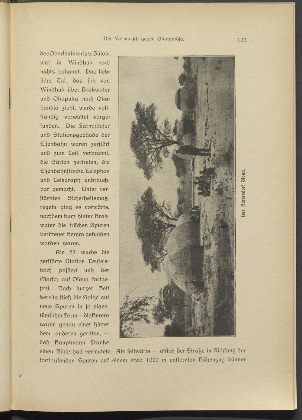Sm 22. wurde die zerstörte Station ^eukels- bach passiert und der Marsch auf Osona fortgesetzt. Nach kurzer Zeit bereits stietz die Spitze auf neue Spuren in so eigentümlicher §orm - dielöerero waren genau einer hinter dem anderen geritten, - dah Sauptmann §ranke