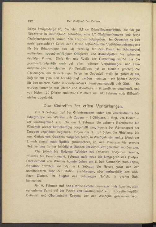 Sechs Feldgeschütze 9b, die vier 5,7 cm Schnellkeuergeschützs, die sich zur Reparatur in Deutschland befanden, eine 3,7 Maschinenkanone und sechs Maschinengewehre waren den Gruppen beigegeben. Im Oegensatz zu den inobiigsmachten Heilen der Marine bestanden die Vsrstärkungstransports kür die Schutztruppe aus sich freiwillig für den Dienst im Schutzgebiet meldenden tropendienstkähigen Offizieren und Mannschaften der gesamten deutschen Armee. Diese Art und Weise der Aufstellung wurde als die zweckentsprechendste auch bei allen späteren Verstärkungen und Neuaufteilungen beibehalten. An Freiwilligen hat es niemals gekehlt; die Meldungen und Sewerbungen liefen im Gegenteil meist so zahlreich ein, daß sie nur zum Deil berücksichtigt werden konnten - ein schönes Zeichen für den unserem Volks innewohnenden Unternehmungsgeist und Mut. - Ls wurden ferner je 500 Pferde und Maultiers in Argentinien angekauft, und von diesen 100 Pferde und 250 Maultiers am 20. Februar nach Südwestafrika abgesandt.