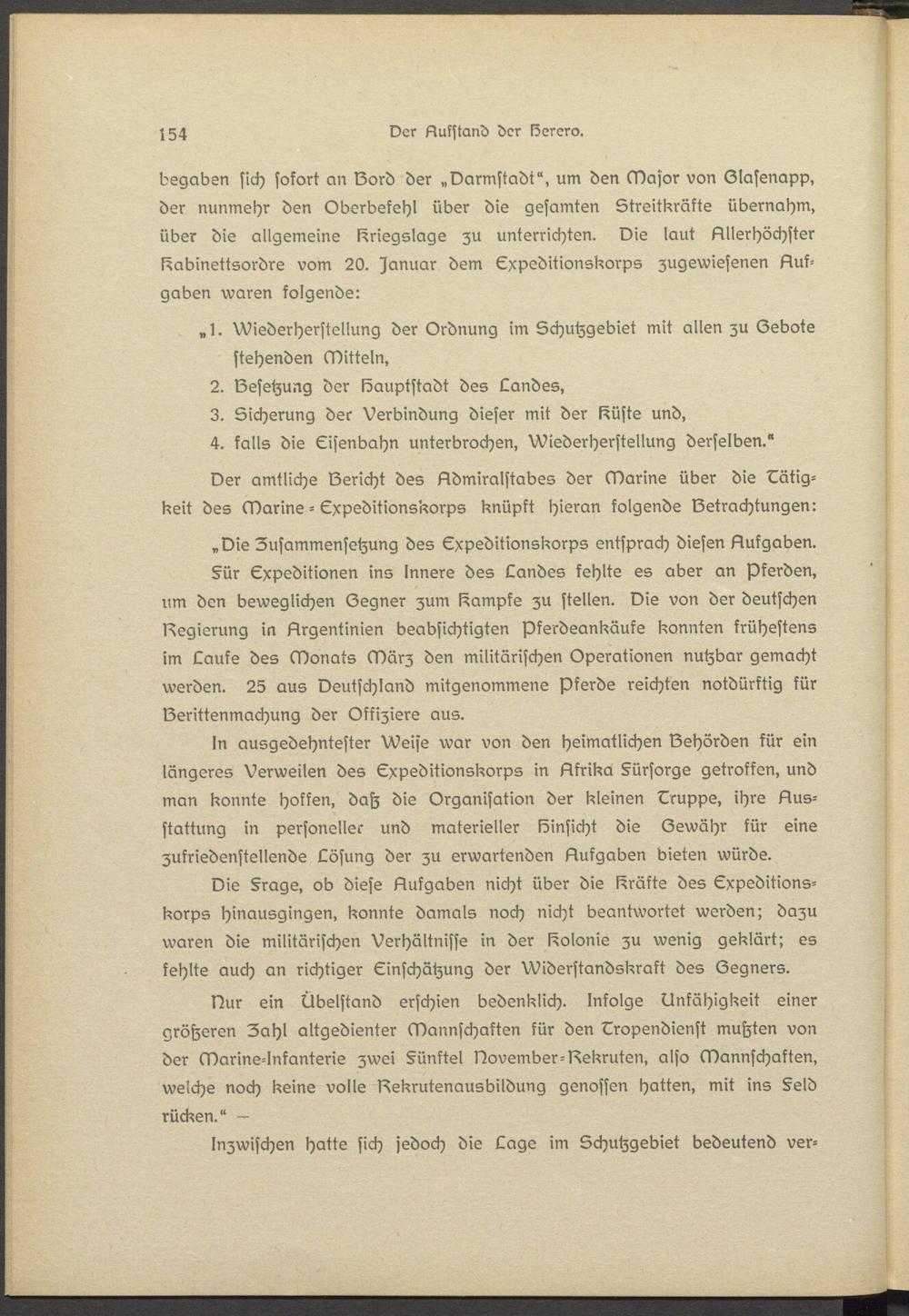 Die §rags, ob diese Aufgaben nicht über die lxräkte des Expeditionskorps hinausgingen, konnte damals noch nicht beantwortet werden; dazu waren die militärischen Verhältnisse in der Kolonie zu wenig geklärt; es kehlte auch an richtiger Einschätzung der Widerstandskraft des (Zsgnsrs.