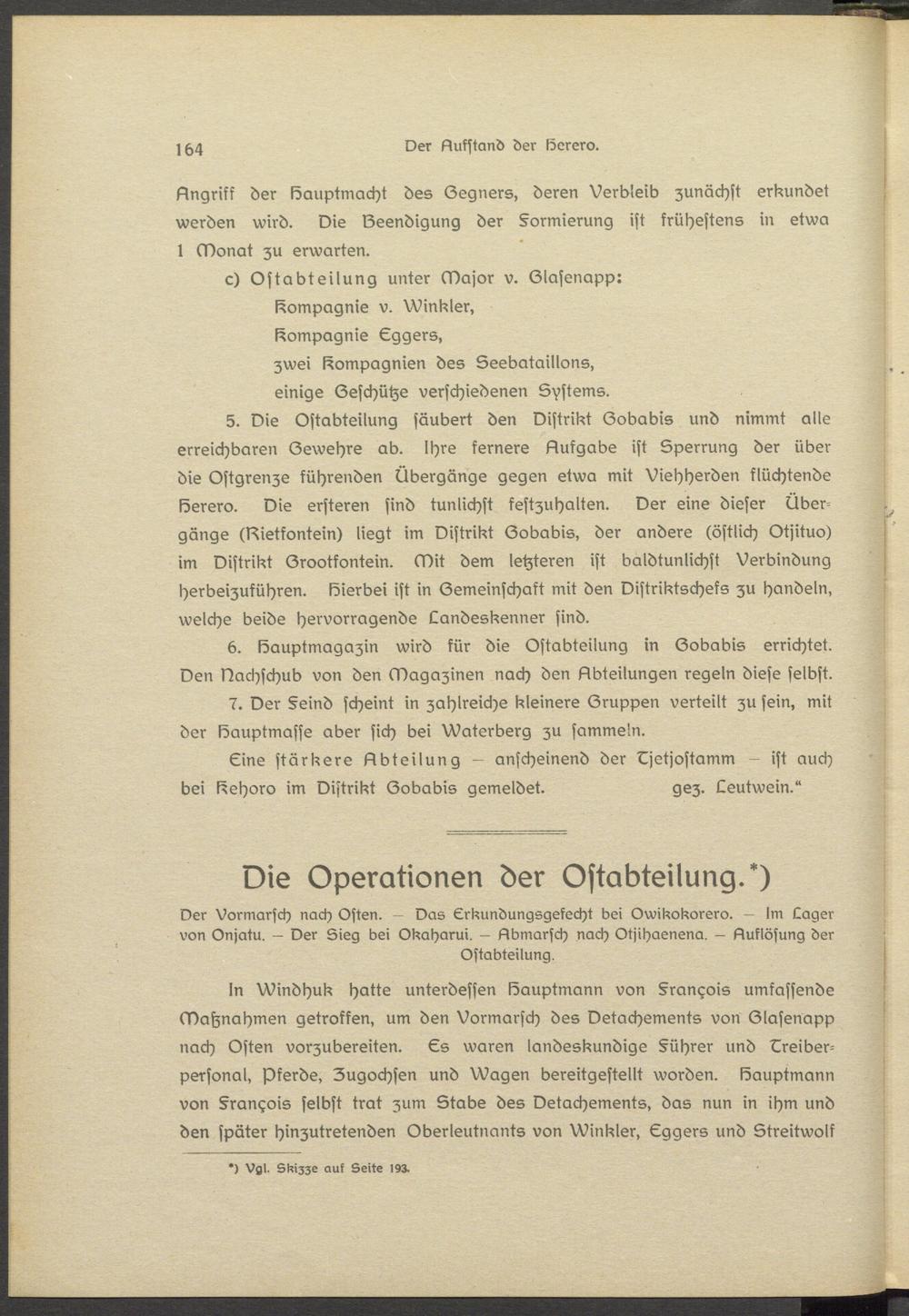 5. Die Ostabteilung säubert den Distrikt Gobabis und nimmt alle erreichbaren Gewehrs ab. Ihre fernere Aufgabe ist Sperrung der über die Ostgrsnze führenden Übergänge gegen etwa mit Viehherden flüchtende Herero. Die ersteren sind tunlichst festzuhalten. Der eine dieser Übergänge (Aiettontsin) liegt im Distrikt Gobabis, der andere (östlich Otjituo) im Distrikt Grootfontsin. Mit dem letzteren ist baldtunlichst Verbindung herbeizuführen. Hierbei ist in Gemeinschaft mit den vistriktscheks zu handeln, welche beide hervorragende Landesksnner sind.