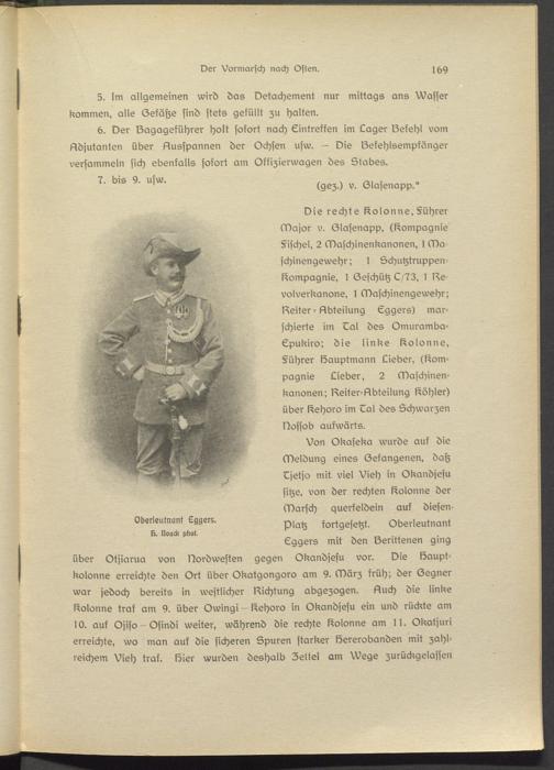 Die rechte Kolonne, §ührer Major v. Blassnapp, (Compagnie §ischel, 2 Maschinenkanonen, t Ma schinengewehr; l Schutztruppsn- Compagnie, l Osschütz L/73, 1 I>e- volvsrkanone, I Maschinengewehr; Beiter-Ltbteilung Eggsrs) marschierte im Lal des Omuramba- Cpukiro; die linke Kolonne, §ührer Sauptmann Lieber, (Compagnie Lieber, 2 Maschinenkanonen; Beiter-Libteilung Köhler) über k^shoro im Lal des Schwarzen Bossob aufwärts.