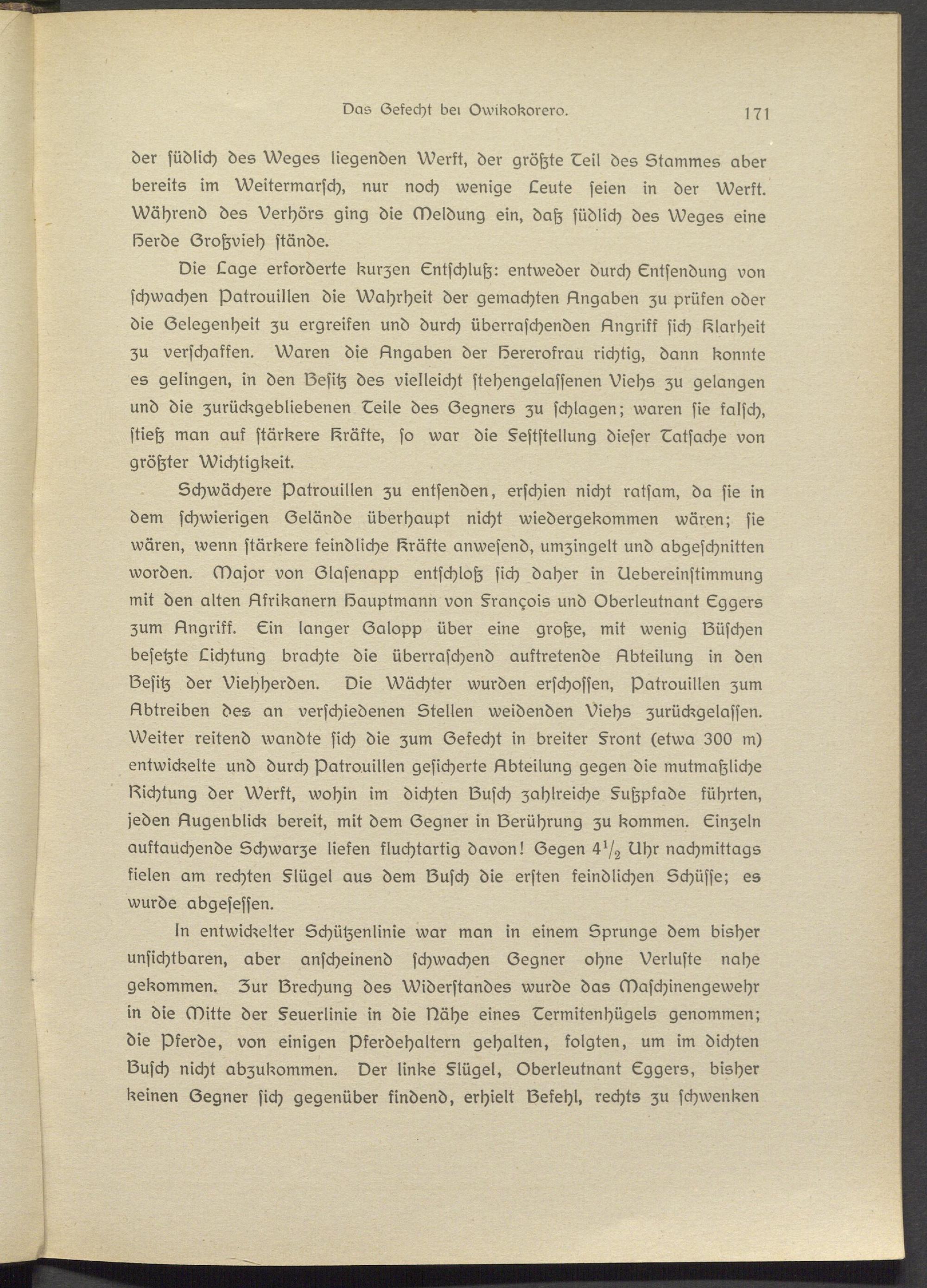 In entwickelter Schützenlinie war man in einem Sprunge dem bisher unsichtbaren, aber anscheinend schwachen Gegner ohne Verluste nahe gekommen. Zur Drschung des Widerstandes wurde das Maschinengewehr in die Mitte der §suerlinie in die Nähe eines Termitenhügels genommen; die Pferde, von einigen pkerdehaltern gehalten, folgten, um im dichten Dusch nicht abzukommen. Der linke §lügel, Oberleutnant Eggers, bisher keinen Gegner sich gegenüber findend, erhielt Dekehl, rechts zu schwenken