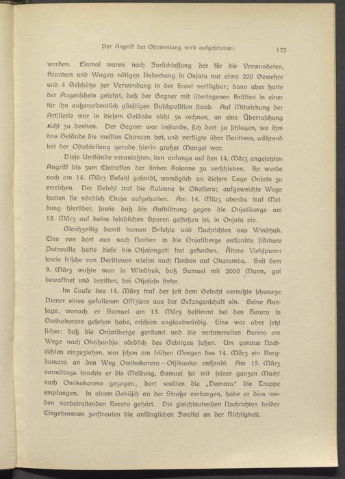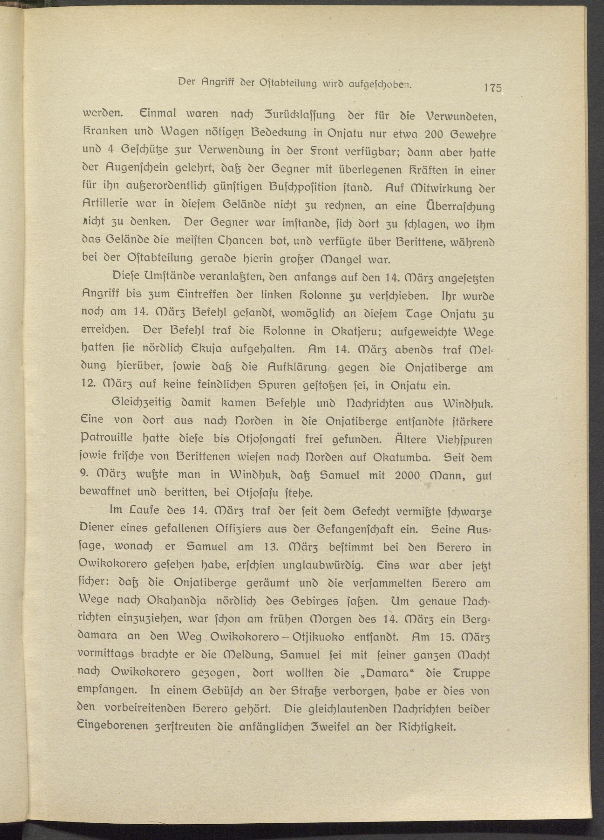 Diese Dmständs veranlaßten, den anfangs auf den 14. März angesetzten Angriff bis zum Gintreffen der linken Kolonne zu verschieben. Ihr wurde noch am 14. März Gekehl gesandt, womöglich an diesem Gags Onjatu zu erreichen. Der Gekehl traf die Kolonne in Okatjeru; aufgeweichte Wege hatten sie nördlich Gkuja aufgehalten. Am 14. März abends traf Meldung hierüber, sowie daß die Aufklärung gegen die Onjatiberge am 12. März auf keine feindlichen Spuren gestoßen sei, in Onjatu ein.