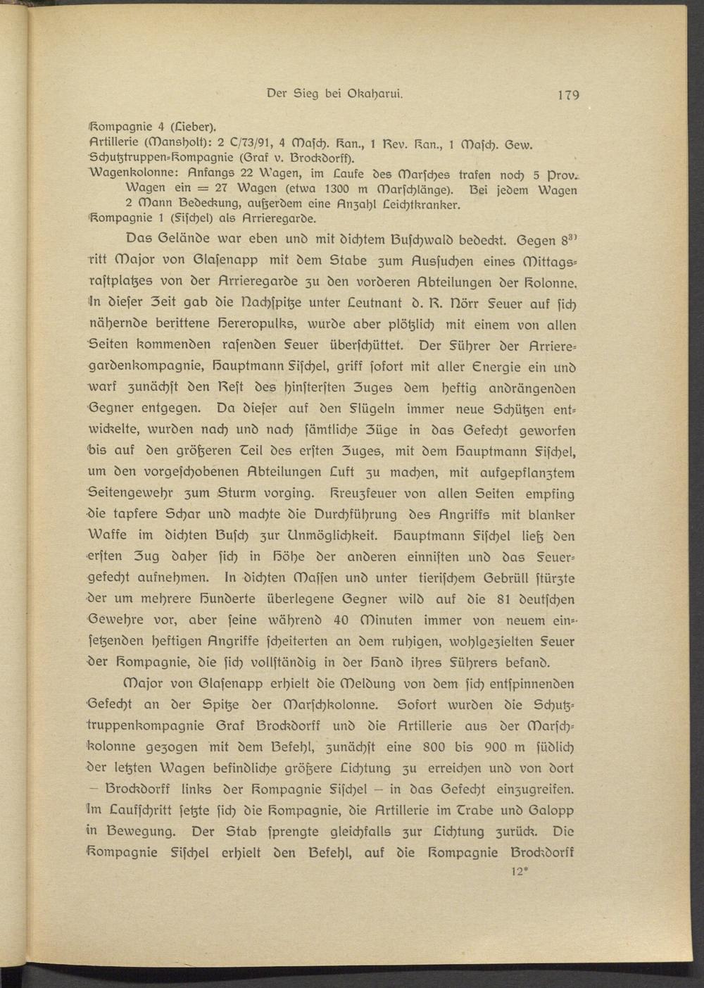 Major von Slasenapp erhielt die Meldung von dem sich entspinnenden Sekecht an der Spitze der Marschkolonne. Sofort wurden die Schutz- truppenkompagnie Srak lZrockdorik und die Artillerie aus der Marschkolonne gezogen mit dem löskehl, zunächst eins 800 bis 900 m südlich der letzten Wagen befindliche größere Lichtung zu erreichen und von dort - IZrockdorff links der Kompagnie Sischel — in das Sekecht einzugreifen. Im Laufschritt setzte sich die Kompagnie, die Artillerie im Lrabs und Salopp in Sewegung. Der Stab sprengte gleichfalls zur Lichtung zurück. Die Compagnie Sischel erhielt den löekehl, auf die Kompagnie Srockdorsk