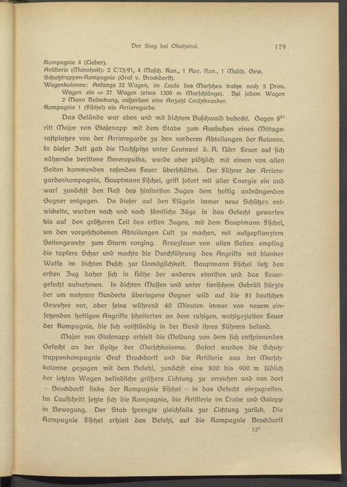 Das Selände war eben und mit dichtem IZuschwald bedeckt. Segen 8^ 7itt Major von Slasenapp mit dem Stäbe zum Aussuchen eines Mittagsrastplatzes von der Arrisrsgards zu den vorderen Abteilungen der Kolonne. In dieser Zeit gab die Dachspitze unter Leutnant d. A. Dörr §euer auf sich nähernde berittene lösrsropulks, wurde aber plötzlich mit einem von allen Seiten kommenden rasenden §euer überschüttet. Der Sichrer der Arrisrs- gardsnkompagnie, löauptmann Sischel, griff sofort mit aller Snsrgie ein und warf zunächst den Aest des hinstersten Zuges dem heftig andrängenden Segnsr entgegen. Da dieser auf den Slügsln immer neue Schützen entwickelte, wurden nach und nach sämtliche Züge in das Sekecht geworfen 'bis auf den größeren Leil des ersten Zuges, mit dem löauptmann Sischel, um den vorgeschobenen Abteilungen Luft zu machen, mit aufgepflanztem Seitengewehr zum Sturm vorging. Kreuzfeuer von allen Seiten empfing -die tapfere Schar und machte die Durchführung des Angriffs mit blanker Waffe im dichten löusch zur Unmöglichkeit, löauptmann Sischel ließ den ersten Zug daher sich in lööhs der anderen einnisten und das Seuer- gekecht aufnehmen. In dichten Massen und unter tierischem Sebrüll stürzte der um mehrere löunderts überlegene Segnsr wild auf die 81 deutschen Sewehre vor, aber seine während 40 Minuten immer von neuem einsetzenden heftigen Angriffe scheiterten an dem ruhigen, wohlgszielten Seuer der Kompagnie, die sich vollständig in der löand ihres Sührers befand.