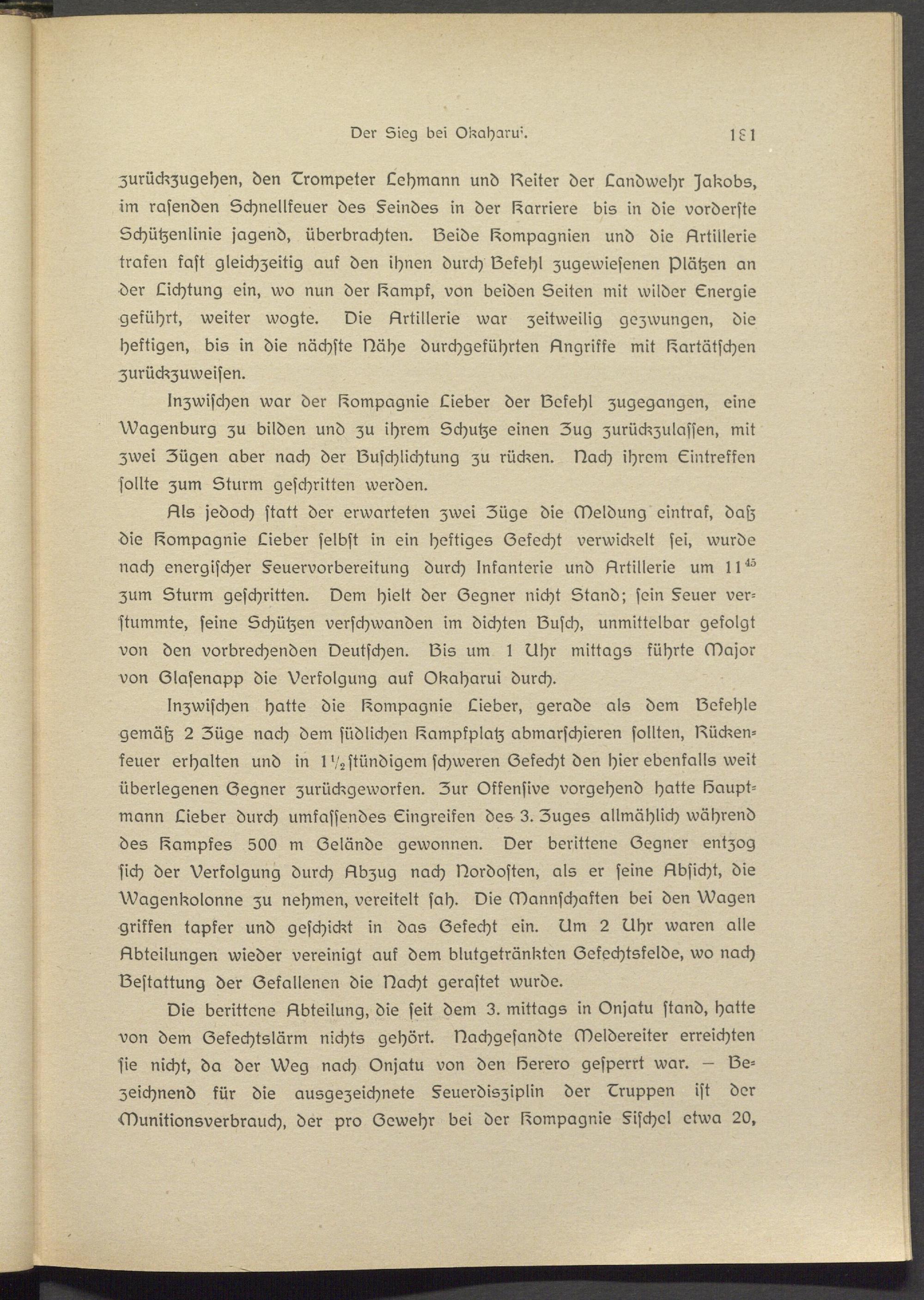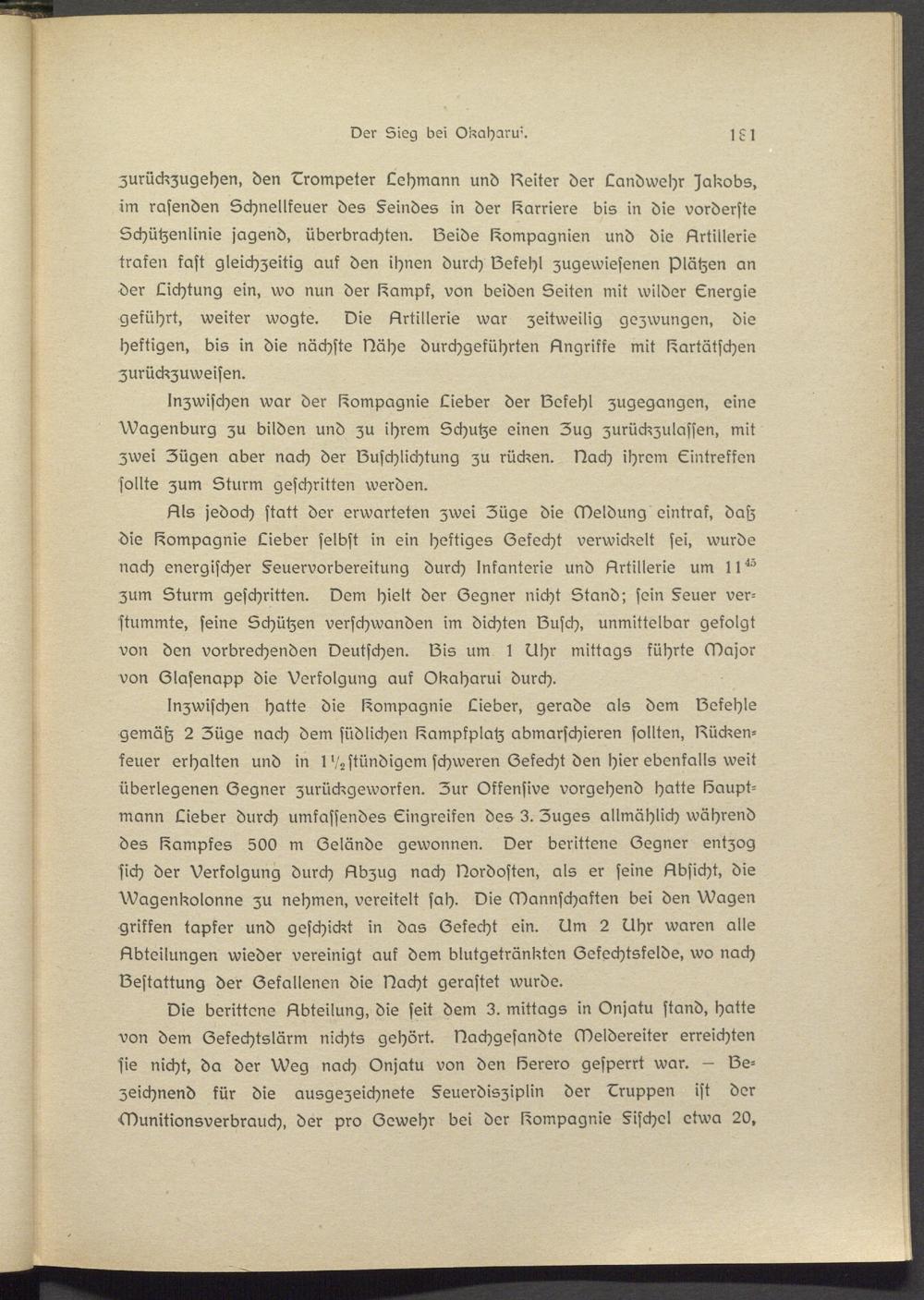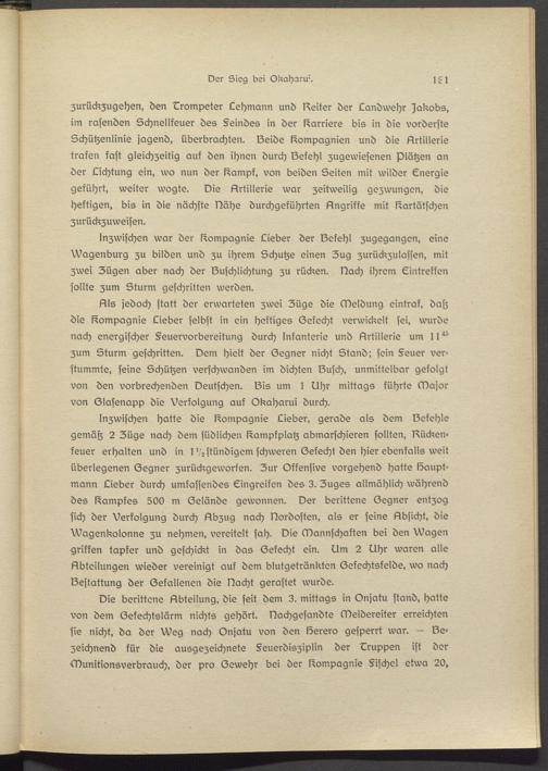 Als jedoch statt der erwarteten zwei Züge die Meldung eintraf, datz die Compagnie Lieber selbst in ein heftiges (Zekecht verwickelt sei, wurde nach energischer §eusrvorbsreitung durch Infanterie und Artillerie um 11^ zum Sturm geschritten. Dem hielt der (Zegner nicht Stand; sein §susr verstummte, seine Schützen verschwanden im dichten lausch, unmittelbar gefolgt von den vorbrechsnden Deutschen. lZis um t Uhr mittags führte Major von (Zlasenapp die Verfolgung auf Okaharui durch.