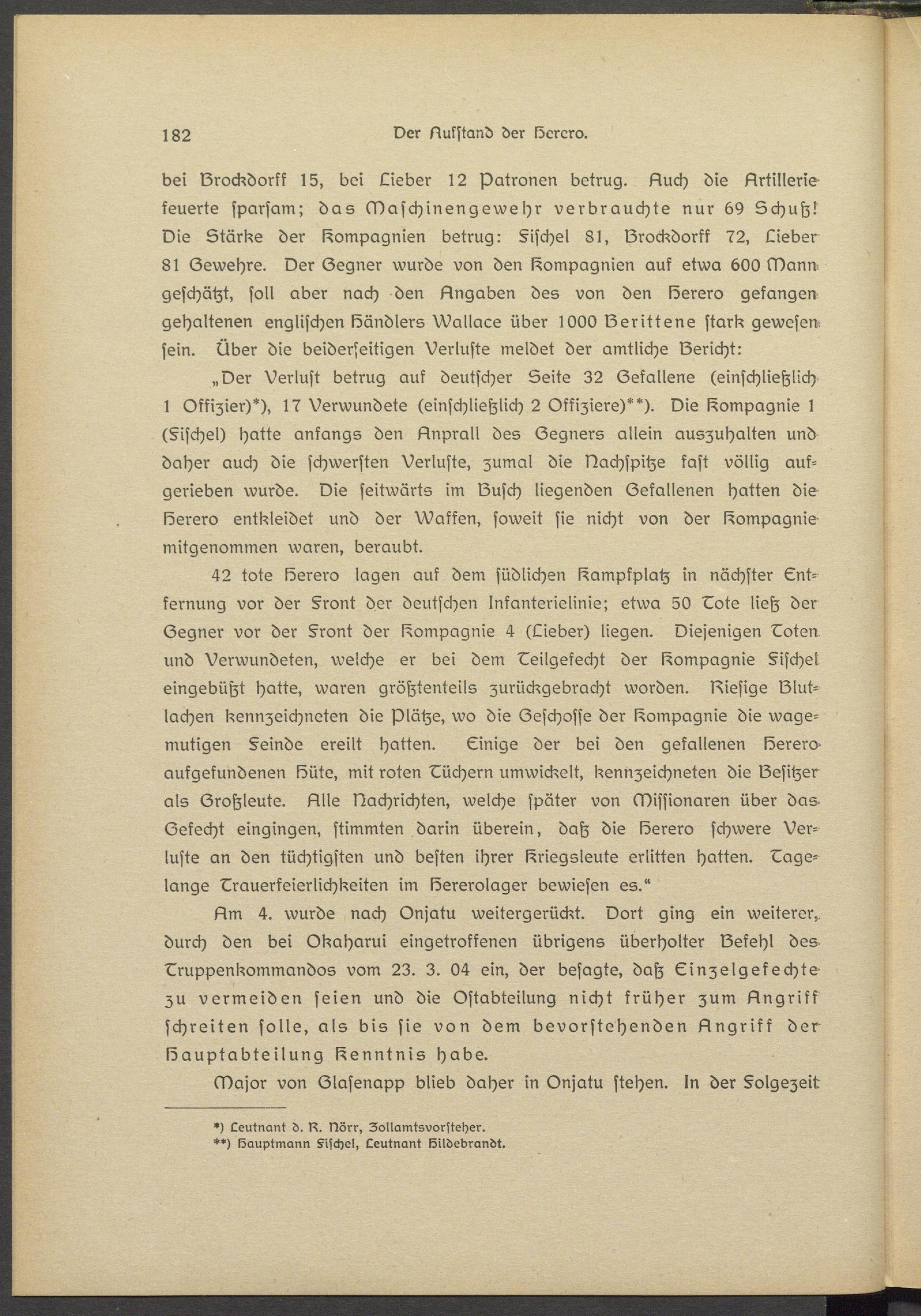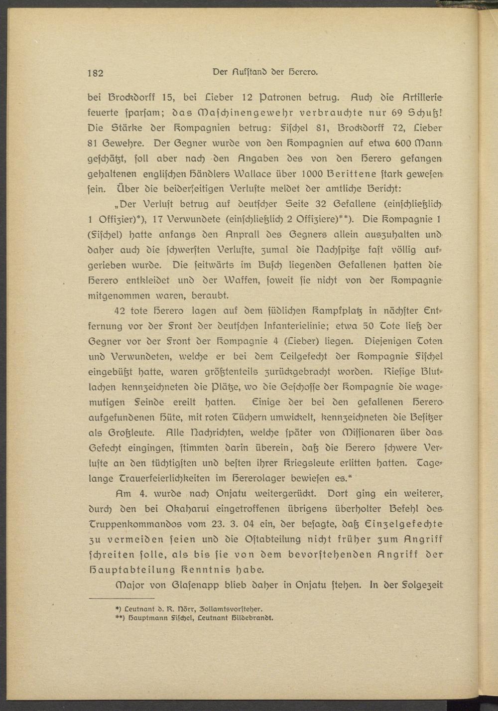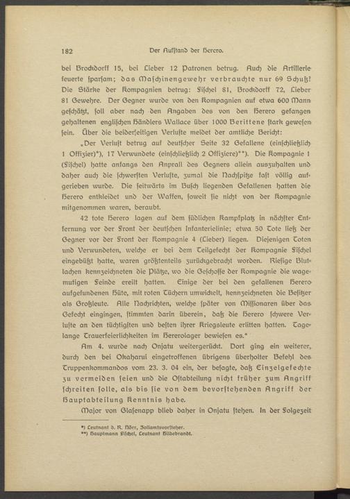 bei Srockdorkf 15, bei Lieber 12 Patronen betrug. Lluch die Llrtillerie feuerte sparsam; das Maschinengewehr verbrauchte nur 69 Schuh! Die Stärke der Compagnien betrug: §ischel 81, IZrockdorff 72, Lieber 81 Oewehre. Der Gegner wurde von den Compagnien auk etwa 600 Mann geschätzt, soll aber nach den Angaben des von den iösrsro gefangen gehaltenen englischen löändlsrs Wallace über 1000 Gerittene stark gewesenem. Über die beiderseitigen Verluste meldet der amtliche Bericht: