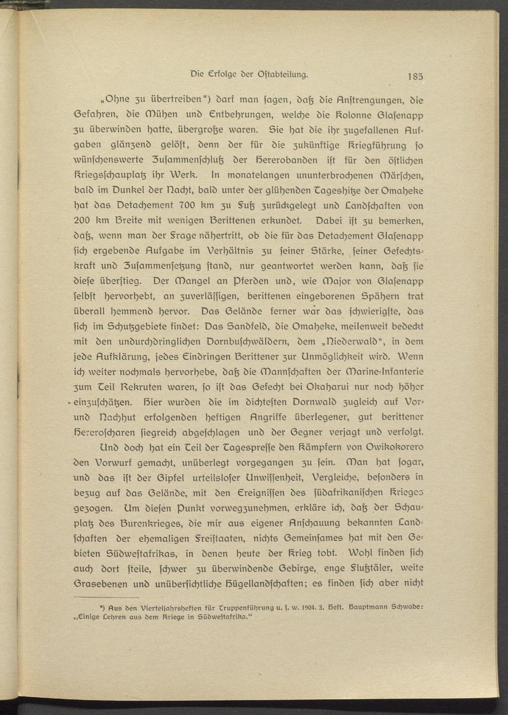 „Ohne zu übertreiben*) darf man sagen, daß die Anstrengungen, die Gefahren, die Mühen und Entbehrungen, welche die Kolonne Glasenapp zu überwinden hatte, übergroße waren. Sie hat die ihr zugefallenen Auk- gabsn glänzend gelöst, denn der kür die zukünftige Kriegführung so wünschenswerte Zusammenschluß der lösrsrobandsn ist kür den östlichen Kriegsschauplatz ihr Werk. In monatslangsn ununterbrochenen Märschen, bald im Dunkel der Nacht, bald unter der glühenden Eagsshitzs der Omahsks hat das Detacheuren! 700 km zu §uß zurückgelegt und Landschaften von 200 km Grsits mit wenigen Gerittenen erkundet. Dabei ist zu bemerken, daß, wenn man der §rags nähertritt, ob die für das Dstachsment (Zlasenapp sich ergebende Aufgabe im Verhältnis zu seiner Stärke, seiner Gsfechts- krakt und Zusammensetzung stand, nur geantwortet werden kann, daß sie diese überstieg. Der Mangel an Pferden und, wie Major von (Zlasenapp selbst hervorhebt, an zuverlässigen, berittenen eingeborenen Spähern trat überall hemmend hervor. Das (Zelände ferner war das schwierigste, das sich im Schutzgebiete findet: Das Sandksld, die Omaheks, meilenweit bedeckt mit den undurchdringlichen Dornbuschwäldcrn, dem „Niederwald", in dem jede Aufklärung, jedes Eindringen Gerittener zur Unmöglichkeit wird. wenn ich weiter nochmals hervorhebe, daß die Mannschaften der Marine-Infanterie zum Esil Gekrutsn waren, so ist das Gefecht bei Okaharui nur noch höher - einzuschätzen. Zier wurden die im dichtesten Dornwald zugleich auf Vor- und Nachhut erfolgenden heftigen Angriffs überlegener, gut berittener Gereroscharen siegreich abgeschlagen und der Gegner verjagt und verfolgt.