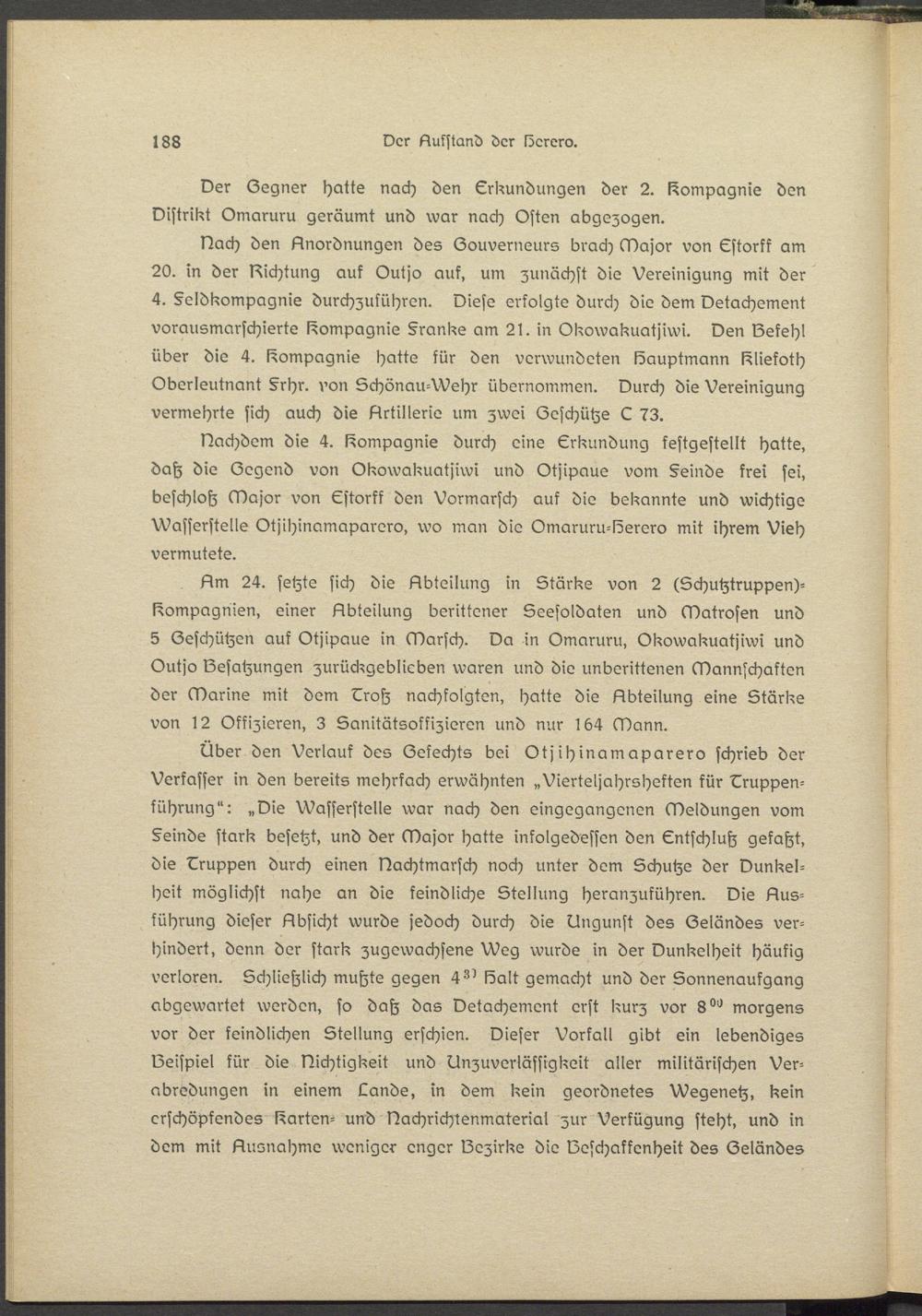 Über den Verlauf des Oekechts bei Otjihinamaparero schrieb der Verfasser in den bereits mehrfach erwähnten „Vierteljahrshektsn kür Eruppsn- führung": „Die Wasserstelle war nach den eingegangenen Meldungen vom §einde stark besetzt, und der Major hatte infolgedessen den Entschluß gefaßt, die Druppsn durch einen Dachtmarsch noch unter dem Schutze der Dunkelheit möglichst nahe an die feindliche Stellung heranzuführen. Die Ausführung dieser Absicht wurde jedoch durch die Ungunst des Oeländes verhindert, denn der stark zugewachsene Weg wurde in der Dunkelheit häufig verloren. Schließlich mußte gegen 4^ Balt gemacht und der Sonnenaufgang abgewartet werden, so daß das Detachement erst kurz vor 8^ morgens vor der feindlichen Stellung erschien. Dieser Vorfall gibt ein lebendiges Beispiel für die Dichtigkeit und Unzuveriässigkeit aller militärischen Verabredungen in einem Lands, in dem kein geordnetes Wegenetz, kein erschöpfendes klarten- und Dachrichtenmateriat zur Verfügung steht, und in dem mit Ausnahme weniger enger Bezirke die Beschaffenheit des Oeländes