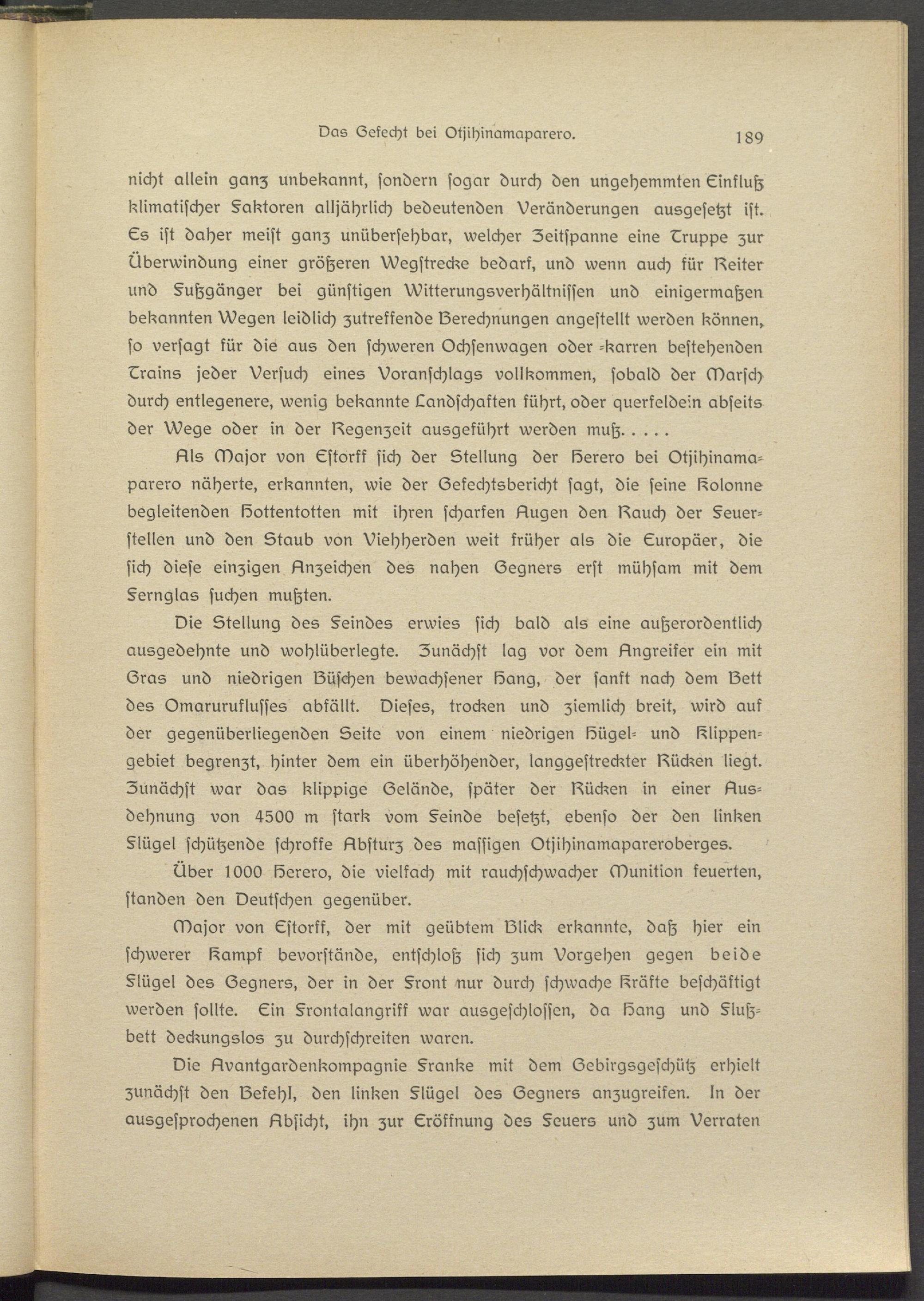 Die Stellung des §sindes erwies sich bald als eins außerordentlich ausgedehnte und wohlüberlegte. Zunächst lag vor dem Bngreiker ein mit Oras und niedrigen Büschen bewachsener Bang, der sankt nach dem Bett des Omaruruklussss abfällt. Dieses, trocken und ziemlich breit, wird auk der gegenüberliegenden Seite von einem niedrigen Bügel- und Blippsn- gebiet begrenzt, hinter dem ein überhöhender, langgestreckter Bücken liegt. Zunächst war das klippigs (Zelände, später der Bücken in einer Busdehnung von 4500 m stark vom §sinds besetzt, ebenso der den linken §lügel schützende schroffe Bbsturz des massigen Otjihinamapareroberges.